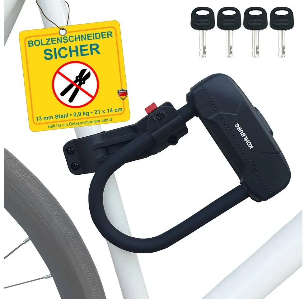 Auf Lager Versand durch AmazonKOHLBURG kleines & leichtes Sicherheits Bügelschloss [900g leicht] - Fahrradschloss mit höchstem Sicherheitslevel 15 - mit 4 Schlüssel & Halterung - U Lock hohe Sicherheit für Fahrrad Ebike e-Scooter
