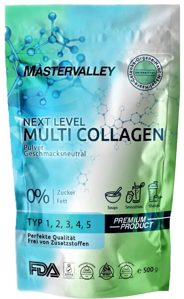 Kategorie: Sportnahrung - Mastervalley - GTIN:4270001870117 - Premium Multi Collagen mit Typ I, II, III, IV & V Mastervalley bietet ein hochwertiges Multi Collagen Pulver mit allen 5 wichtigen Kollagentypen. Unterstützt Haut, Haare, Nägel, Gelenke, Bänder, Sehnen und Organe für ganzheitliches Wohlbefinden. 100 % geschmacksneutral und wasserlöslich Ideal für die tägliche Anwendung: Das Collagenpulver ist vollständig wasserlöslich, geschmacksneutral und perfekt geeignet für Kaffee, Smoothies, Shakes, Müsli oder Suppen. Kein Klumpen, kein Eigengeschmack. Hochwertiges Aminosäurenprofil und bioaktive Peptide Reich an essenziellen Aminosäuren wie Glycin, Prolin, Hydroxyprolin für Zellerneuerung, Regeneration und Hautelastizität. Frei von Zucker, Zusatzstoffen, Gluten und Laktose. Laborgeprüfte Reinheit. Stärkt Haut, Haare, Nägel und unterstützt die Gelenkfunktion Fördert ein jugendliches Hautbild, kräftigt die Haarstruktur und unterstützt stabile Nägel. Gleichzeitig wirkt es als Unterstützung für Knorpel, Gelenke und Knochen auch ideal für Sport und Alltag. Nachhaltig produziert Collagen aus Weidehaltung Das Kollagen stammt aus kontrollierter Weidehaltung frei von Hormonen, Antibiotika und Gentechnik. Entwickelt und geprüft in Deutschland für höchste Qualität und Reinheit. - 39,90 Euro bei Amazon Marketplace Health & Personal Care - gefunden von billiger.de Dieses Kollagenpulver zeichnet sich durch seine bioaktiven Peptide der Typen 1, 2 und 3 aus, ist "Made in Germany" und bietet eine optimale Löslichkeit, was es zu einer hochwertigen und praktischen Wahl macht. ![]() ![]() SHEKO Premium Kollagen Pulver 500g + Shaker - Natürliches Bioaktives Kollagen Hydrolysat - Peptide Typ 1, 2, 3 - Collagen Pulver - Optimale Löslichkeit - Proteinpulver - Made in Germany