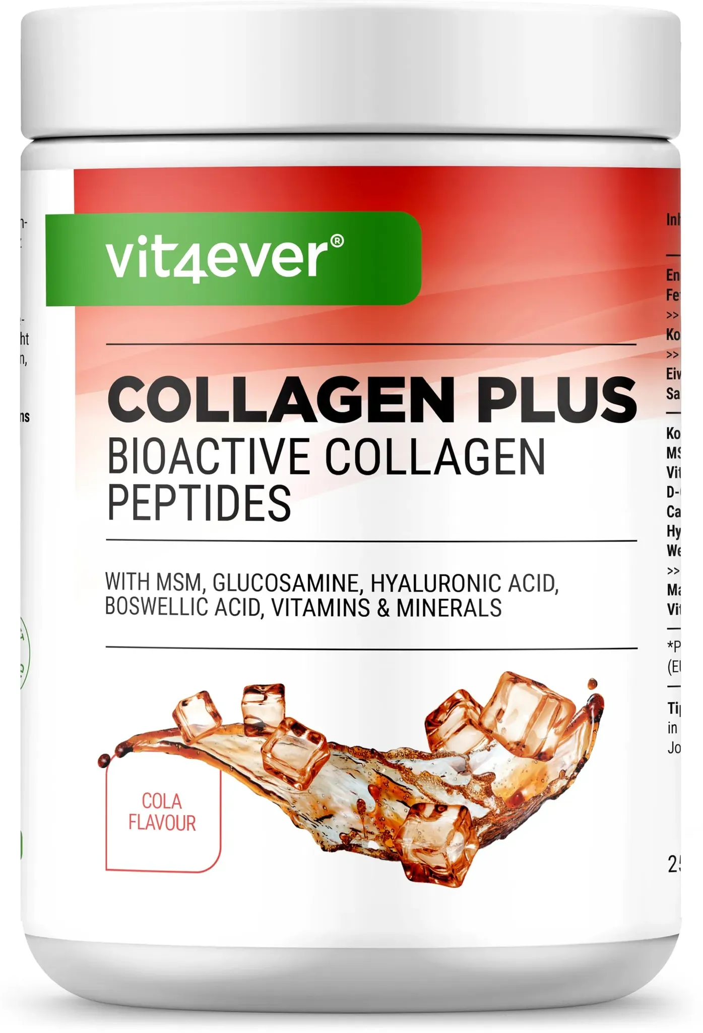 Kategorie: Nahrungsergänzungsmittel - Vit4ever - GTIN:4260601198988 - SINNVOLL KOMBINIERT: Collagen Plus vereint hydrolysiertes Kollagen, Weihrauch-Extrakt, Hyaluronsäure, Glucosaminsulfat, MSM sowie sorgfältig ausgewählte Vitamine und Mineralstoffe. Die einzigartige Zusammensetzung wurde speziell entwickelt, um vielfältige Bedürfnisse zu erfüllen. Dank der durchdachten Kombination hochwertiger Inhaltsstoffe werden Synergieeffekte gefördert, die eine optimale Unterstützung für Ihren Körper bieten. PREMIUM KOLLAGEN: Unser Collagen Plus enthält hochwertiges Kollagenpulver mit 93 % natürlichem, gut verdaulichem Protein aus den Typen I, II und III. Dank der optimalen Molekülgröße von 2,0 kDa wird eine effektive Aufnahme und schnelle Verfügbarkeit der Nährstoffe im Körper ermöglicht. VIELSEITIG EINSETZBAR: Unser Collagen Plus wird in einer praktischen 500g Dose geliefert. Mit seinem leckeren Geschmack, dem beiliegenden Messlöffel und der perfekten Löslichkeit lässt es sich mühelos in den Alltag integrieren, ideal für die tägliche Versorgung. FREI VON SCHADSTOFFEN: Collagen Plus enthält hochwertiges Rinderkollagen aus artgerechter Haltung. Es ist frei von Schadstoffen, Antibiotika und Hormonen und zudem halal, für maximale Reinheit und Qualität. VIT4EVER QUALITäT: Das Vit4ever Sortiment bietet eine Vielzahl an Nahrungsergänzungsmitteln für jede Zielgruppe. Unsere Produkte werden aus hochwertigen Premium-Rohstoffen gefertigt und ausschließlich in sorgfältig ausgewählten ... Dieses Produkt bietet undenaturiertes Kollagen Typ 2 in hochdosierter Form, kombiniert mit Vitamin C und Boswellia Serrata, speziell für die Gelenkgesundheit und wird in Deutschland produziert sowie extern laborgeprüft. ![]() ![]()
