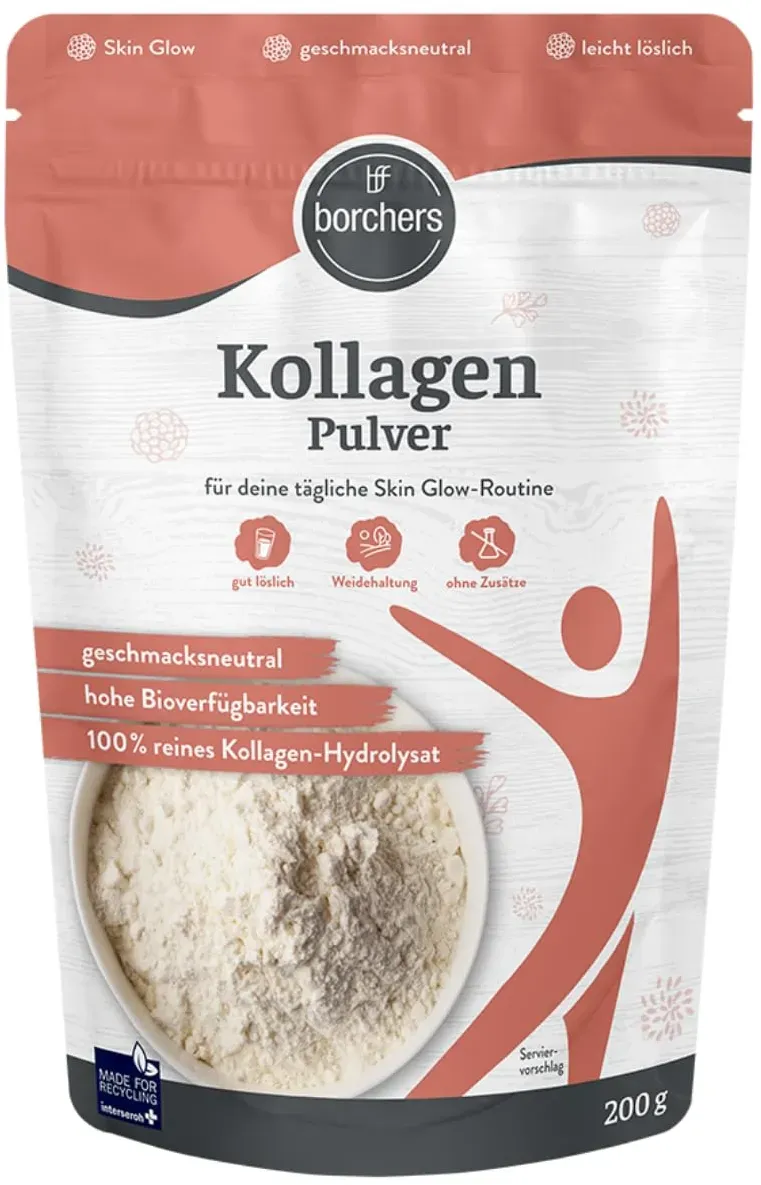 Sonstiges Vitamine & Ergnzungen - EAN:4009932136203 - Anwendungsgebiet von Doppelherz Kollagen GumsDie Doppelherz Kollagen Gums enthalten pro Tagesportion (2 Gums) 1000 mg Kollagenhydrolysat - ganz ohne knstliche Farbstoffe und mit natrlichem Aroma. Die Gums bieten eine einfache Mglichkeit, Kollagen in den Alltag und in die tgliche Routine zu integrieren. Kollagen ist das am hufigsten vorkommende Protein im menschlichen Krper und befindet sich vor allem in der Haut, im Knochen, Knorpel und Bindegewebe.Wirkstoffe / Inhaltsstoffe / ZutatenZutaten von Doppelherz Kollagen Gums:Kollagenhydrolysat, Glukosesirup, Zucker, resistente Strke, Suerungsmittel Citronensure, Gelatine, Karottenkonzentrat, natrliches Aroma, Kokosl, berzugsmittel Carnaubawachs, berzugsmittel Bienenwachs wei und gelbGegenanzeigenBei bekannter berempfindlichkeit gegenber einen der oben genannten Inhaltsstoffe sollte dieses Produkt nicht angewendet werden.DosierungVerzehrempfehlung von Doppelherz Kollagen Gums:Tglich 2 Gums verzehren.HinweiseNahrungsergnzungsmittel stellen keinen Ersatz fr eine abwechslungsreiche Ernhrung dar. Eine ausgewogene Ernhrung und gesunde Lebensweise sind wichtig. Die empfohlene tgliche Verzehrmenge sollte nicht berschritten werden. Auerhalb der Reichweite von kleinen Kindern aufbewahren. Khl und trocken lagern.Nicht fr Kinder unter 1 n geeignet. Doppelherz Kollagen Gums knnen in Ihrer Versandapotheke www.juvalis.de erworben werden. - gefunden von Kelkoo BORCHERS Kollagen Pulver ist eine sehr preisgünstige Option für reines Kollagenhydrolysat ohne Zuckerzusatz. ![]() ![]() BORCHERS Kollagen Pulver 200g, Premium Kollagenhydrolysat, Kollagenpeptide Typ 1 & 3, leicht löslich, ohne Gentechnik, Ohne Zuckerzusatz, Skin-Glow-Routine