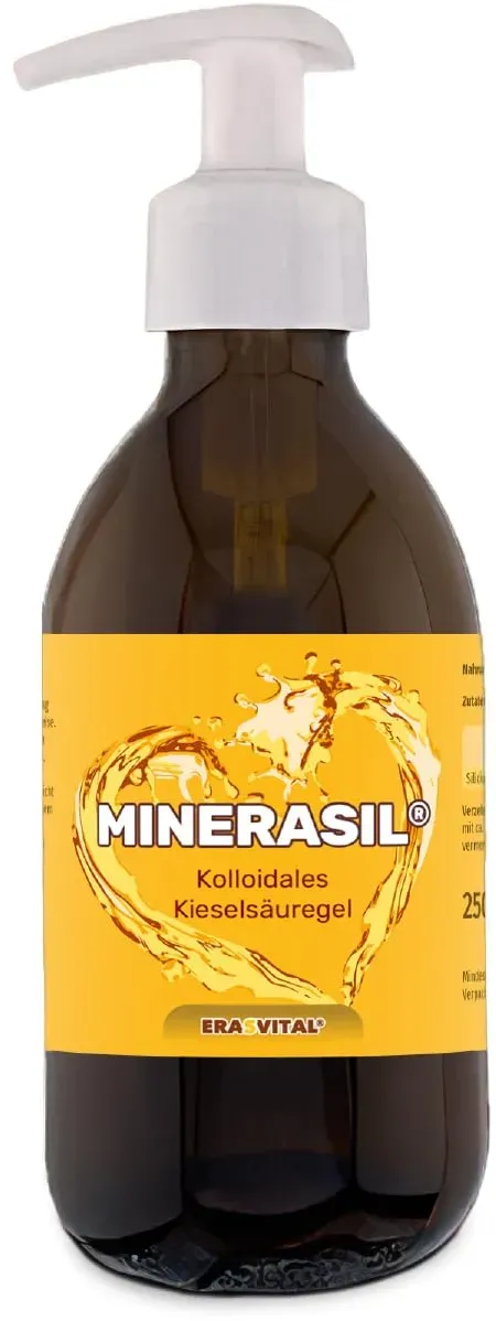 Kategorie: Nahrungsergänzungsmittel - Bärbel Drexel - GTIN:4050838626084 - AQUA SILICIA: Es besteht aus kolloidalem Silicium in levitiertem Wasser. Darunter versteht man fein verteiltes Silicium in belebtem Wasser, bekannt aus der Naturheilkunde. Dadurch ist es für den menschlichen Organismus besonders gut verwertbar. Silizium ist ein wichtiger Bestandteil des Binde- und Stützgewebes und ein wichtiges Strukturelement. Es kommt in Gefäßwänden, Knorpeln und in den Knochen vor. Es kann daher die Pflege unterstützen bei Verschleißerscheinungen u. a. in Gelenken und Sehnen. Silicium hat die Fähigkeit Wasser zu binden und ist damit ebenfalls geeignet zur unterstützenden Pflege bei Hautalterung, Falten, rissiger und trockener Haut, dünnen Haaren und brüchigen Nägeln. Um im Körper Silicium aufzubauen, ist es empfehlenswert, eine erste Siliciumkur über mindestens 3-6 Monate durchzuführen. Später eignet sich eine kurmäßige Anwendung von mindestens 6 Wochen, 2-3-mal im Jahr. Natürlich Natur: Glutenfrei, laktosefrei, gentechnikfrei, vegan und frei von synthetischen Konservierungsstoffen für hohe Bioverfügbarkeit und Qualität. Service-Versprechen: Du hast Fragen zu unseren Produkten oder Deiner Bestellung? Unser kompetentes Team aus Heilpraktikern, Ernährungswissenschaftlern und Naturheilkunde-Experten hilft Dir jederzeit gerne weiter. - 21,00 Euro bei Amazon Marketplace Health & Personal Care - gefunden von billiger.de ERASVITAL MINERASIL zeichnet sich durch Premiumqualität und einen hygienischen Pumpverschluss aus, der eine einfache und genaue Dosierung ermöglicht. ![]() ![]() ERASVITAL MINERASIL 250 ml Kolloidales Silizium in Premiumqualität mit hygienischem Pumpverschluss zur präzisen Dosierung. Pro Verzehrempfehlung (3,8 ml) = 200 mg elementares Silizium.