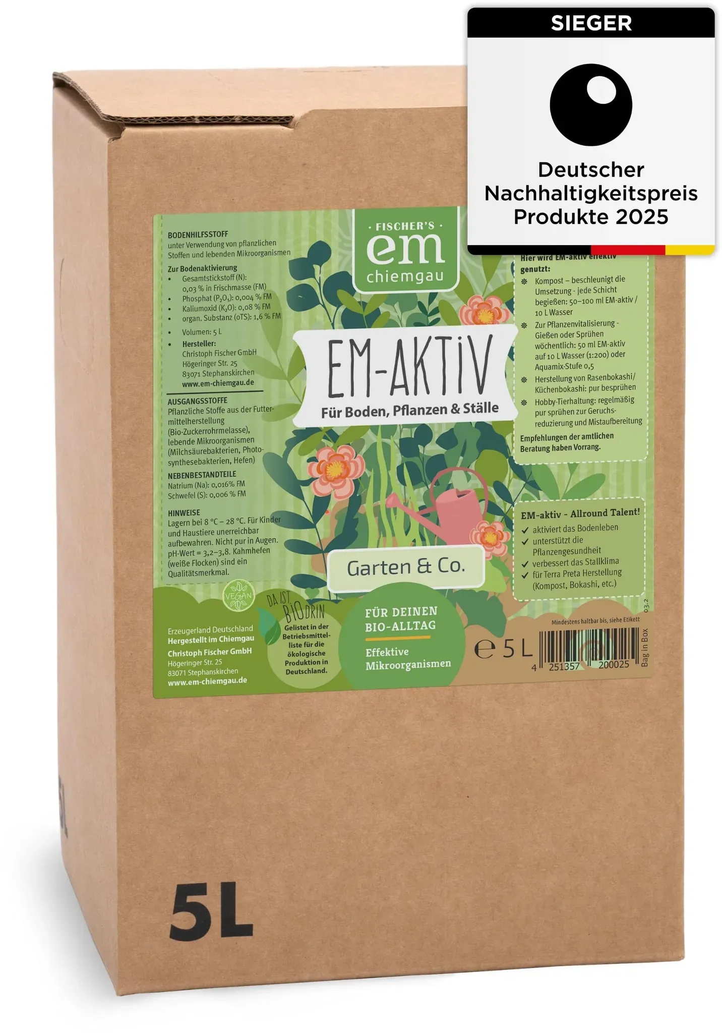Kategorie: Pflanzendünger - Oscorna - GTIN:4005494002208 - Inklusive gratis Oleanderhof Flyer Lieferumfang 1x Oscorna Kompostbeschleuniger 5kg - 19,65 Euro bei Amazon Marketplace Lawn & Garden - gefunden von billiger.de Ein flüssiger Kompostbeschleuniger mit Effektiven Mikroorganismen, der auch als Bodenhilfsstoff dient. ![]() ![]() fischer s em-chiemgau EM-Chiemgau Effektive Mikroorganismen EM-aktiv Bodenaktivator Wurzelaktivator [Anwendungsfertig] Flüssiger Kompostbeschleuniger & Bodenhilfsstoff für Pflanzen, Obst & Gemüse - 5 L