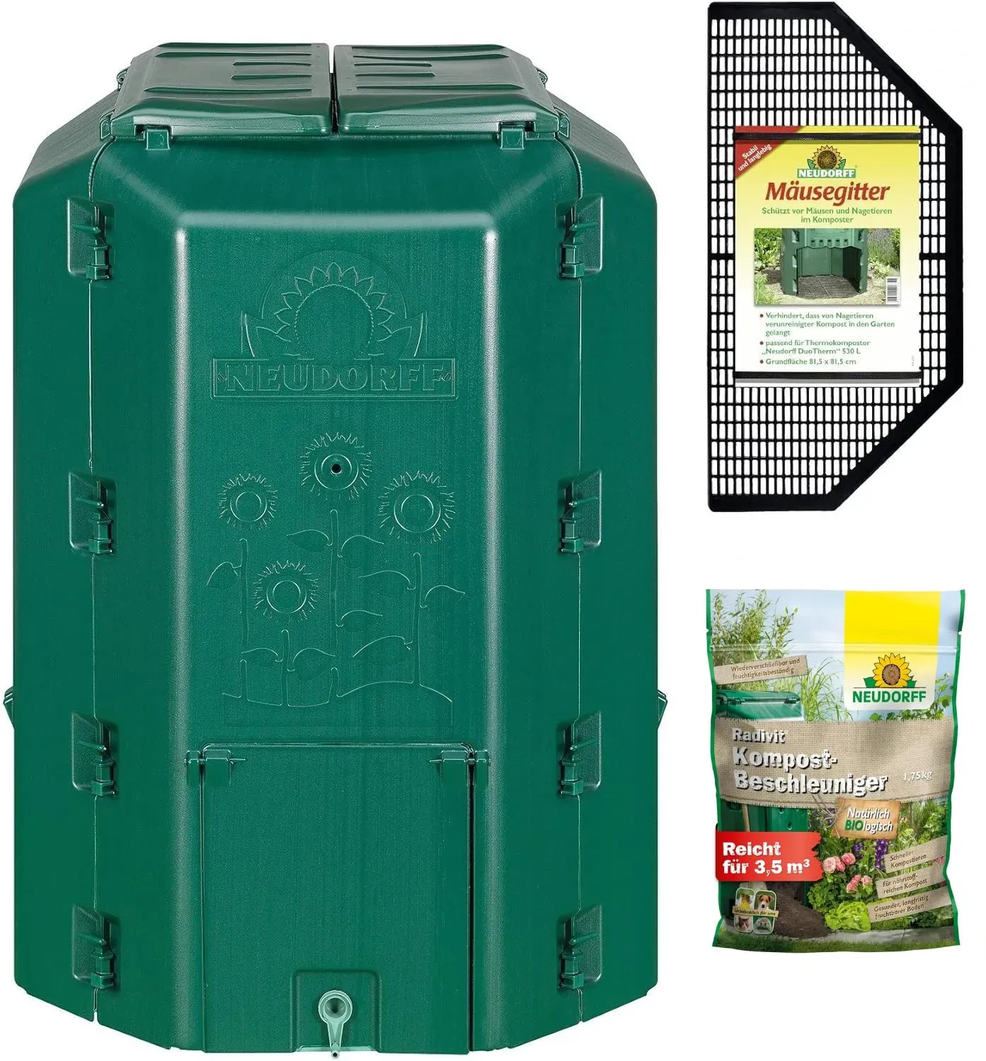 Kategorie: Pflanzenzubehör - fischer s em-chiemgau - GTIN:4251357200445 - Hohe Wasserhaltefähigkeit sorgt für länger feuchte Beete und verhindert Trockenstress & ständiges Nachgießen. 45 L Pflanzenkohle reichen für 75-150 qm Fläche. Selbst bei Starkregen bleiben Nährstoffe da dank puffernder Kohlestruktur; mach den Regenguss-Test : Beet bleibt versorgt statt ausgewaschen. Küchen-Bokashi ohne Warten 30 50 ml RoPro-Streu pro Schicht streuen, mit EM besprühen, luftdicht schließen geruchsarmer Eimer, nach 4 8 Wochen erdfertig einarbeiten. Wie hältst du den Boden so lange feucht? Das hörst du öfter, wenn RoPro-Streu Wasserspeicher & Nährstoffpuffer übernimmt CO2 im Boden speichern, Klima & Garten profitieren. Kennst du das? Der Kompost stinkt, verliert Nährstoffe und muss ständig gewendet werden? Damit ist Schluss! Mit RoPro-Streu als Kompost- & Bokashi-Beschleuniger läuft die Fermentation sauber & zügig weniger Geruch, weniger Arbeit, schneller reife Erde. - 40,80 Euro bei Amazon Marketplace Lawn & Garden - gefunden von billiger.de Ein umfassendes Set, das einen Thermokomposter und Kompostbeschleuniger kombiniert, ideal für eine effiziente Kompostierung. ![]() ![]() Neudorff Thermokomposter mit Mäusegitter DuoTherm 530 L & Radivit Kompostbeschleuniger (5 kg) rattensicherer Komposter für Küchenabfälle - Komposttonne mit Recycling Kunststoff
