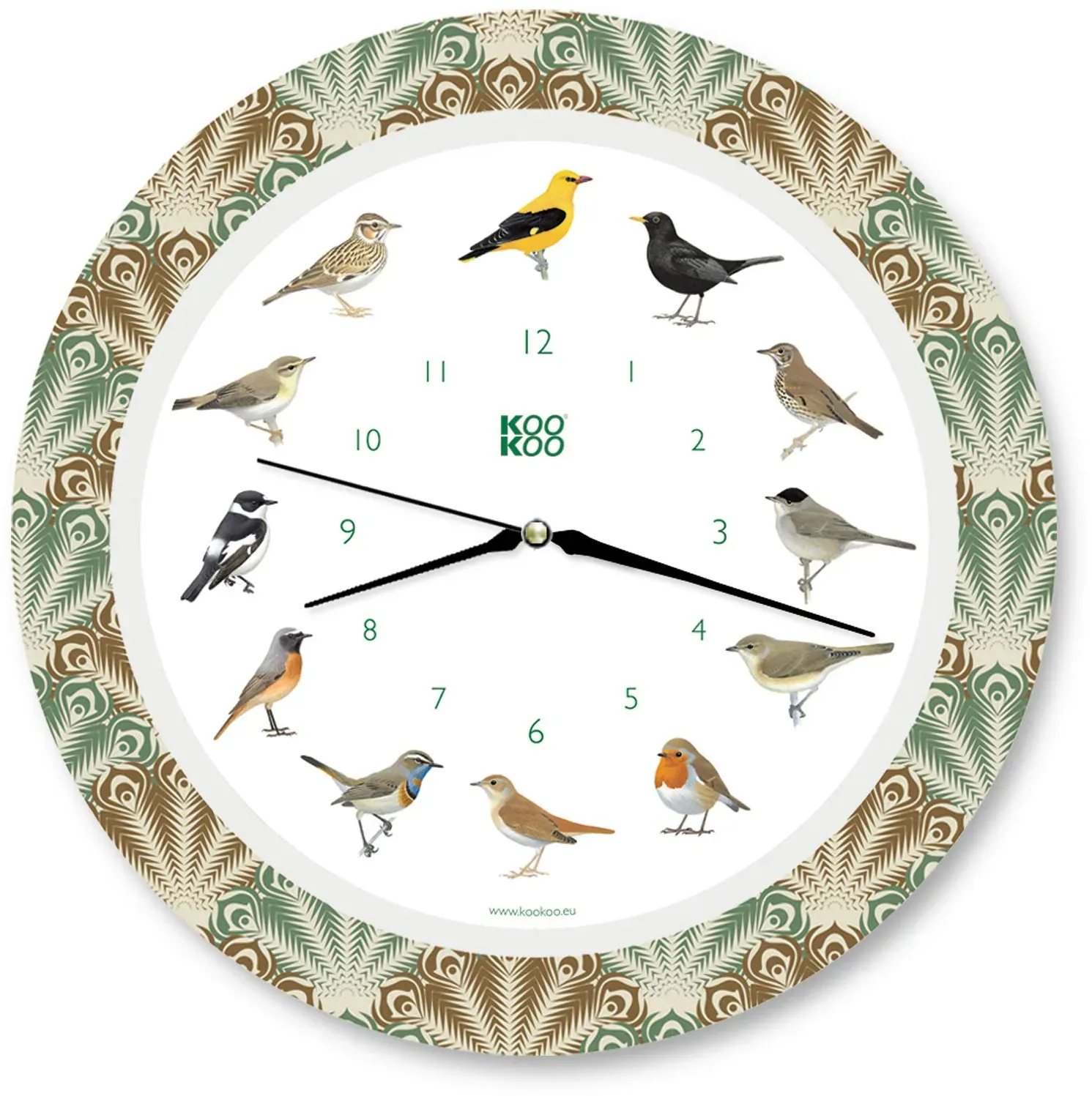 Zustand: Neu - Wanduhren - KOOKOO KooKoo GmbH - KW4000W - EAN: 4260019360281 - Kids, aufgepasst: Holt euch den Bauernhof ins Kinderzimmer! Zu jeder vollen Stunde erinnert eines von 12 Bauernhoftieren daran, wie spät es gerade ist: Um sieben Uhr miaut das Kätzchen, zur Mittagszeit grunzt das Schweinchen und der kleine Hund erinnert um 16 Uhr bellend an seinen Nachmittagsspaziergang. Alle Tierstimmen sind Originalaufnahmen aus der Natur und für ca. 15 Sekunden zu hören. Dank eines Lichtsensors herrscht nachts Ruhe auf der kleinen Farm. Das kindgerechte Design macht das Ablesen der Uhrzeit zur leichten Übung. Neben jeder Zahl auf dem Zifferblatt findet sich ein lustiges, farbiges Tiermotiv der bekannten Kinderbuch-Illustratorin Monika Neubacher-Fesser. Auf der Wanduhr mit Tiergeräuschen ist was los, so macht das Lernen der Uhrzeit richtig Spaß. Mitgeliefert wird eine Begleitbroschüre mit einem Frage- und Antwortspiel sowie einer Malvorlage der fröhlichen Tiermotive zum Aus- und Nachmalen. KooKoo KidsWorld hat einen Durchmesser von 34 cm und ist mit 6 verschiedenen Rahmenfarben oder mit einem Holzrahmen erhältlich. Durchmesser 34 cm, Material: Kunststoff, Holz oder Alu und Glas, Batterien: 3 x AA 1,5 V (nicht im Lieferumfang) - Verkäufer: KooKoo GmbH, Hallbergmoos im amazon.de Marketplace Diese Singvögel-Uhr in Holzoptik bietet eine hochwertige Ästhetik und natürliche Vogelstimmen für ein warmes Ambiente. ![]() ![]() KOOKOO Singvögel Quarzwerk Holz, Die Singende Vogeluhr, runde Wanduhr mit natürlichen Vogelstimmen