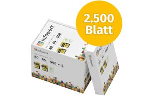 - - Unser hochwertiges Infowerk Druckerpapier und Kopierpapier ist die ideale Wahl für alle Ihre Druck- und Kopieranforderungen ob zuhause oder im Büro. Mit seiner Grammatur von 80 g und seinem hohen Weißgrad (CIE 160) sorgt es für gestochen scharfe Ausdrucke und klare Kopien. Menge: 2.500 Blatt = 5 Päckchen á 500 Blatt Dicke: 110 μm Opazität: 95% Glattheit: 28s 80 g Premium Weiß (CIE 160) Unser Infowerk Druckerpapier und Kopierpapier wird aus nachhaltig bewirtschafteten Wäldern hergestellt und ist mit dem PEFC-Zertifikat (GFA-PEFC-COC-500582) ausgezeichnet. Dank der hohen Opazität unseres Kopierpapier A4, 95% bei 80g, verhindert unser Druckerpapier das Durchscheinen von Texten und Bildern auf der Rückseite des Briefbogens. Entdecke unsere Auswahl an Druckerpapier und Kopierpapier A4, ideal für all deine Druck- und Kopieranforderungen. Egal, ob du kleine Mengen wie 500, 1.500 oder 2.500 Blatt für dein Homeoffice oder größere Mengen wie 5.000 Blatt für das Büro benötigst, unser Infowerk Druckerpapier und Kopierpapier ist in der passenden Packungsgröße erhältlich. Wir bieten Kopierpapier A4 an, ohne dabei Kompromisse bei der Qualität einzugehen. Unser Infowerk Druckerpapier und Kopierpapier A4 80g ist perfekt für den täglichen Gebrauch und überzeugt im Produktvergleich gegenüber Alternativen - insbesondere bei Dicke und Weißgrad. Das Beste ist: Das Infowerk Druckerpapier und Kopierpapier ist mit dem PEFC-Siegel ausgezeichnet. So kannst du guten Gewissens drucken und ... ![]() ![]() Kopierpapier A4 - Amazon Basics eBay 80 g/m² 2500 Blatt Weiß 5×500 Blatt