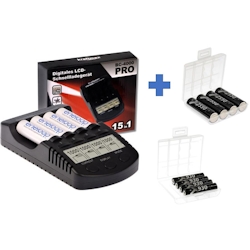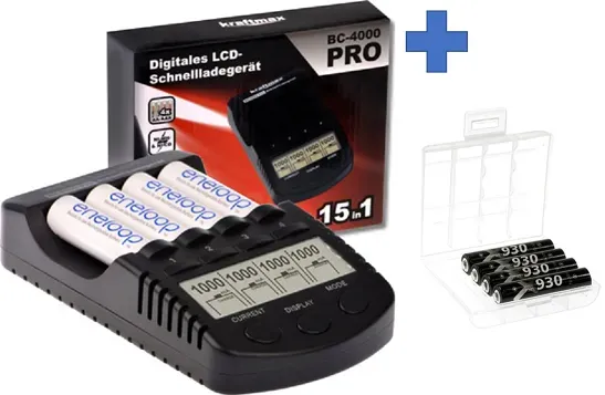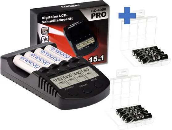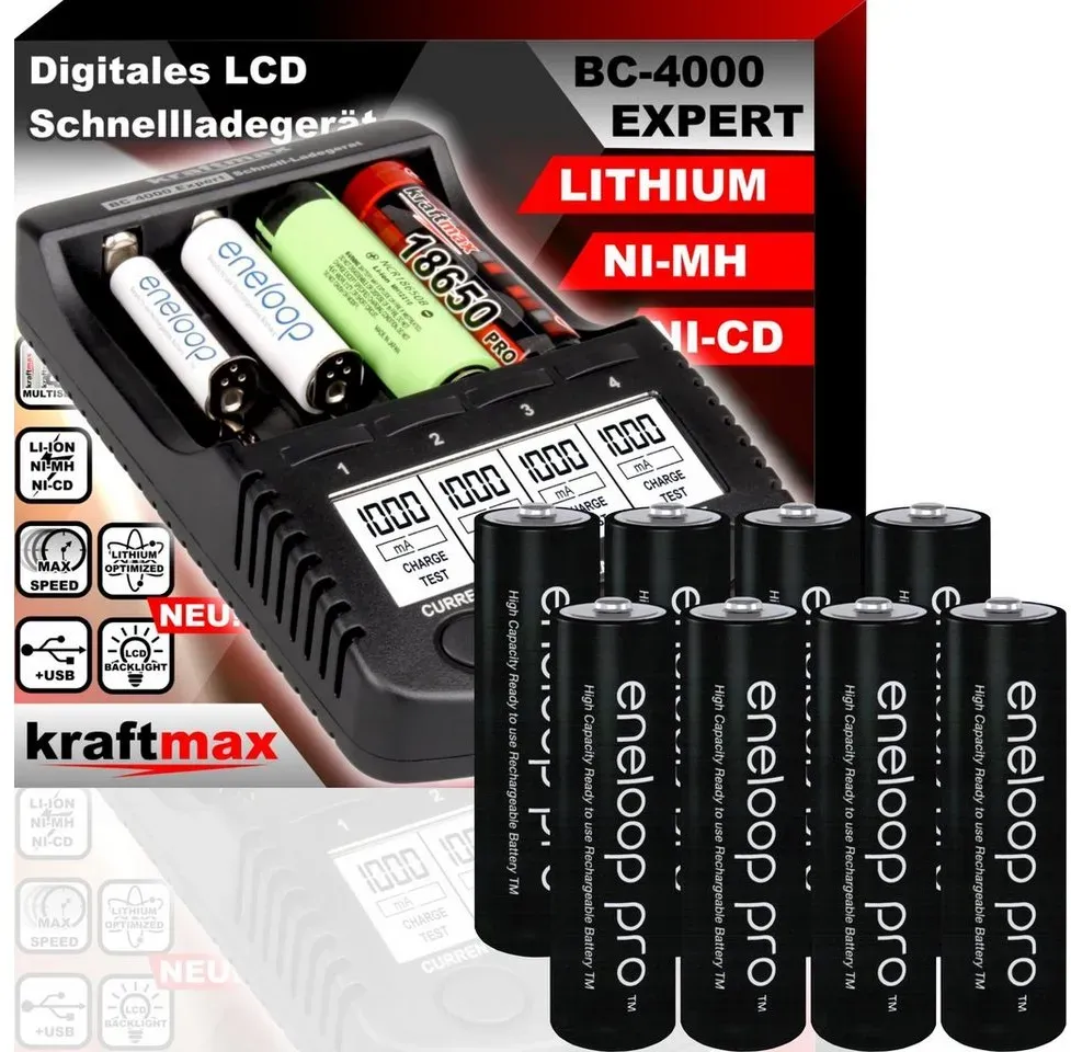 Zustand: Neu - Akkus - kraftmax Kraftmax - BC-4000 Pro 4051287047451 - EAN: 4051287047451 - Lieferumfang:Kraftmax Kombipack - Kraftmax BC-4000 Pro Ladegerät und 4x Eneloop PRO XX AA / Mignon Akkus - Verkäufer: Akku-Spezialist Ein gutes Angebot für das Ladegerät mit 8 Micro AAA Akkus, ideal für Nutzer mit vielen Kleingeräten. ![]() ![]() XCell Kraftmax BC-4000 Pro Akku & USB Ladegerät + 8x LSD Plus Micro AAA 930mAh Akkus + 2 Box