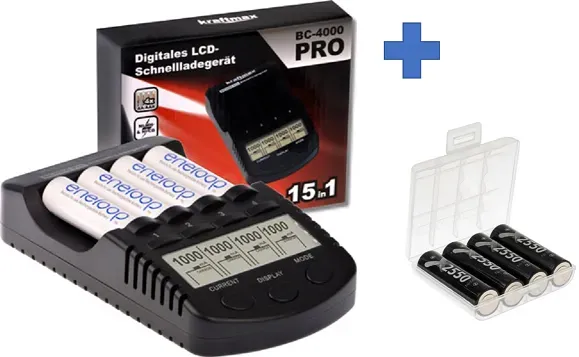 Zustand: Neu - Ladegeräte für Haushaltsbatterien - kraftmax - 836157e8-1212-490b-bc22-dc8c3b115729 - EAN: 4051287052080 - œ Kraftmax BC-4000 EXPERT Ladegerät mit intelligenter Ladetechnologie - Automatische Erkennung von Akkutypen und optimierte Ladezyklen für maximale Lebensdauer. Perfekt für 18650, 26650, AA, AAA, C, D und mehr. 🔋 Individuelle Ladeoptionen - Wählbarer Ladestrom pro Schacht: 300mA, 500mA, 700mA, 1000mA - für schnelles oder schonendes Laden je nach Bedarf. 📊 LCD-Display mit Echtzeit-Informationen - Zeigt Ladestatus, Spannung, Kapazität und Innenwiderstand jedes Akkus an, für volle Kontrolle über den Ladevorgang. 🔒 Maximale Sicherheit - Integrierter Verpolungsschutz, Überladungsschutz und Akku-Defekterkennung sorgen für sicheres und zuverlässiges Laden. 🌠Energieeffizient & umweltfreundlich - Optimierte Ladezyklen verlängern die Lebensdauer deiner Akkus und reduzieren Abfall - nachhaltig und kostensparend. - 3 Händler im amazon.de Marketplace Dieses Kombipack ist eine gute Option für Einsteiger, da es das Ladegerät und 4 Eneloop AA Akkus zu einem fairen Preis enthält. ![]() ![]() kraftmax Kombipack BC-4000 Pro Ladegerät und 4X Eneloop AA/Mignon Akkus - Neueste Generation - Hochleistungs Akku Batterien Akkubox V5