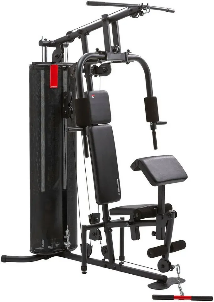 Kategorie: Stationen & Hantelbänke - Christopeit - GTIN:4044163022802 - Die Kraftstation SP 2000 von Christopeit Sport ist die ideale Lösung für dein Home Gym, wenn du auf platzsparende Weise ein umfassendes Ganzkörpertraining absolvieren möchtest. Sie vereint verschiedene Trainingsmöglichkeiten in einem Gerät und ermöglicht gezielte übungen für Brust, Rücken, Arme, Beine und Bauch. Dank integrierter Module wie Latzug, Butterfly, Brustpresse, Bizepscurls sowie Beinbeuger und Beinstrecker kannst du abwechslungsreich und effektiv trainieren. Durch die vielfältigen übungsoptionen bringst du mehr Dynamik in dein Training und beugst einseitigen Belastungen oder monotone Abläufe vor. Die mitgelieferten Steckgewichte erlauben eine Belastung von etwa 5,6 kg bis 45 kg. Optional lässt sich das Gewicht mit einem zusätzlichen Set auf bis zu 56 kg erweitern ideal für individuelle Trainingsfortschritte. Der höhenverstellbare, komfortabel gepolsterte Sitz ermöglicht eine ergonomisch angepasste Trainingsposition, unabhängig von der Körpergröße. So lassen sich gezielt bestimmte Muskelgruppen aktivieren und die Effektivität des Workouts steigern. Hochwertige Details und eine durchdachte Konstruktion sorgen dabei für zusätzlichen Komfort und Funktionalität im Vergleich zu anderen Kraftstationen. Die stabile Stahlrohrkonstruktion mit schwarzer Edellackierung verleiht der SP 2000 nicht nur Stabilität, sondern auch ein modernes, hochwertiges Erscheinungsbild perfekt für dein persönliches ... ![]() ![]() Marcy Eclipse HG3000 Kompakte Kraftstation, Multifunktionale Fitnessstation, Multistation mit Butterfly, Bizepscurl, Latzug, Beinstrecker, 68kg Gewichtsblock