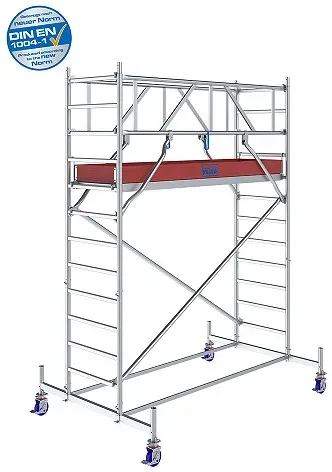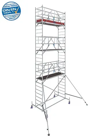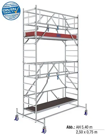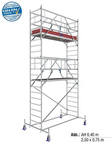 Leitern Gerüste Wohnen Haus Garten Heimwerken - - Das massive ProTec XXL mit extra großer Arbeitsfläche für effizientes Arbeiten. Belastbarkeit 200 kg/m² nach DIN EN 1004-1. Max. Arbeitshöhe 12,30 m. Durch die Befestigung des Geländerrahmens GuardMatic- System vor dem Einhängen der nächsthöheren Belagbühne ist der sichere Aufbau gewährleistet. Beim Durchsteigen der Belagbühne ist ein komplettes Geländer und damit eine Absturzsicherung vorhanden. Die Integration der Diagonalen in das GuardMatic-System gewährleistet eine einfache und sichere Montage. Für Transport oder Lagerung kann der Geländerrahmen platzsparend zusammengefaltet werden. Die 6-Punkt-Fixierung des GuardMatic-Systems sorgt für ma- ximale Stabilität in der Höhe. Kraftschlüssige halbautomatische Diagonalen-Verbindungen ermöglichen den einfachen, schnellen und sicheren Aufbau. Die innovative Form der Diagonalen bietet eine maximale Nutzfläche auf der Belagbühne und stört in keiner Weise. Maximaler Belagbühnenabstand von 2 m für komfortablen und sicheren Aufbau ohne Hilfsmittel. Sicherer Innenaufstieg durch rutschhemmende profilierte Sprossen. Zwei im Lieferumfang enthaltene 1-Meter Vertikalrahmen, die zu einem 2-Meter Vertikalrahmen zusammengesteckt werden können, ermöglichen flexiblen Aufbau. Wetterfeste und rutschhemmende Belagbühnen mit einer Arbeitsfläche von 2,00 m x 1,20 m. Gebremste, höhenverstellbare Fahrrollen zum Ausgleich von Bodenunebenheiten. Leicht zu montierende Ausleger sorgen ab einer ... Ein Fahrgerüst mit 6,40 m Arbeitshöhe, das sich für mittelhohe Arbeiten eignet und der neuen Norm DIN EN 1004-1 entspricht. ![]() ![]() KRAUSE STABILO Serie 10 AH 6,40 m / 2,00 m Feldlänge - Alu-Fahrgerüst | Neue Norm DIN EN 1004-1 - Art-Nr: 771049
