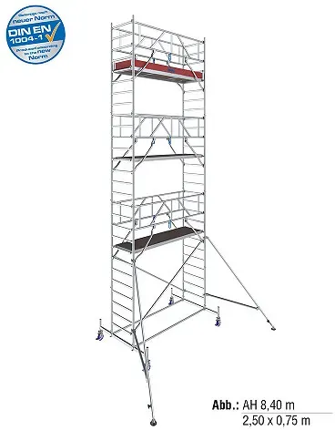 Kategorie: Gerüste - Krause - GTIN:4009199771049 - KRAUSE STABILO Serie 10 AH 6,40 m / 2,00 m Feldlänge - Alu-Fahrgerüst | Neue Norm DIN EN 1004-1 - Art-Nr: 771049 - 2146,42 Euro bei accipo - gefunden von billiger.de Dieses Gerüst bietet eine beachtliche Arbeitshöhe von 8,40 m und ist ideal für anspruchsvollere Projekte. ![]() ![]() KRAUSE STABILO Serie 10 AH 8,40 m / 2,00 m Feldlänge - Alu-Fahrgerüst | Neue Norm DIN EN 1004-1 - Art-Nr: 771063