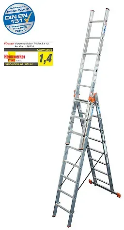 14 Händlerangebote bei billiger.de - Kategorie: Leitern - Krause - Marke: KRAUSE Farbe: silberfarben Serienname: MONTO Technische Daten Tragfähigkeit (max.): 150 kg Leiterart: Gelenkleiter, Vielzweckleiter Maßangaben Sprossenabstand: 28 cm Arbeitshöhe: 343 cm Transportmaß: 48x245 mm cmMaterialangaben Material: Aluminium Funktionen und Ausstattung Witterungsbeständig: Ja Schiebbar: Ja Rutschsicher: Ja Anzahl Sprossen: 24 Normen DIN/ISO/EN: EN131 Lieferung Lieferumfang: 1x Sprossen-Vielzweckleiter TRIBILO - GTIN:4009199129741 Toom.de Krause Vielzweckleiter mit Treppenfunktion 'Tribilo' 3 x 8 Sprossen