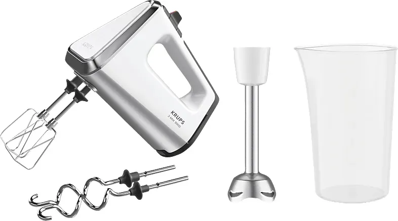 Auf Lager Versand durch AmazonKrups 3 Mix 9000 Handmixer, 750 Watt, Geschwindigkeitsregler, Turbomodus, ergonomischer Griff, Handrührgerät inkl. Schneebesen, Knethaken, Pürierstab-Aufsatz, Messbecher, weiß/silber, GN9121