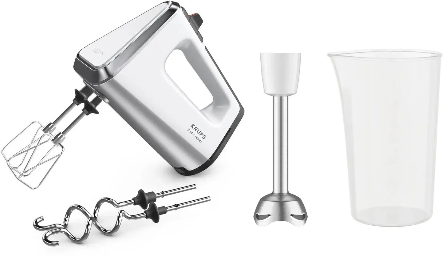 Auf Lager Versand durch AmazonKrups 3 Mix 9000 Handmixer, 750 Watt, Geschwindigkeitsregler, Turbomodus, ergonomischer Griff, Handrührgerät inkl. Schneebesen, Knethaken, Pürierstab-Aufsatz, Messbecher, weiß/silber, GN9121
