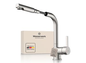 Küchenarmaturen Wohnen - - Ausziehbar:: Dank dem langen Gewebeschlauch können Sie die Armatur ausziehen und so problemlos jeden Winkel Ihrer Spüle erreichen. Cold-Start Funktion:: In der Grundstellung des Armaturengriffs fließt ausschließlich kaltes Wasser durch die Spültischarmatur. So schönen Sie die Umwelt und Ihren Geldbeutel. Made in Germany:: Unsere Armaturen werden im schönen Wallenhorst in Norddeutschland hergestellt und überzeugen durch hohe Qualität und klarem Design. 'Made in Germany' steht für Langlebigkeit und verspricht Ihnen einen kompetenten, freundlichen Kundenservice. Hochwertige Einzelteile:: Die Kartusche vom Marktführer Kerox sorgt für eine konstant leichtgängige Funktion der Armatur. Die Mischdüse des Schweizer Unternehmen Neoperl rt einen dauerhaft schönen Wasserstrahl. Hohe Qualität ist unser Anspruch, daher widerstehen unsere Armaturen dem Härtetest im Salzwasser-Korrosionstest mehr als doppelt so lange wie herkömmliche Baumarktarmaturen. Einfache Montage:: Dank der Zentralverschraubung ist die Armatur in wenigen Minuten montiert - ohne Werkzeug. 1 : Wir sind überzeugt von der Qualität unserer Produkte und bieten daher 1 auf unsere Armaturen (Bedingungen siehe Handbuch). Lieferumfang WASSERWERK WK4AL, Schutzbeutel aus Stoff, 2 vormontierte Anschlussschläuche, Montage-Set inkl. Zentralverschraubung, Handbuch und Quickstarter-Anleitung, Nachhaltige Verpackung, karte, ., Maßangaben: Gewicht: 1.810 g, Breite: 5,7 cm, Höhe: 29,8 cm, Tiefe: 23,3 ... Ein Premium-Modell aus Edelstahl mit hohem Auslauf und Handbrause, das Eleganz und Funktionalität vereint. Megabad.co m