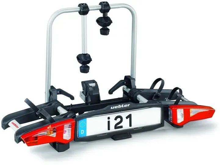 Kategorie: Fahrradträger - Uebler - GTIN:4260230940675 - Uebler i21 Fahrradträger Premium-Kupplungsträger für 2 E-Bikes Der Uebler i21 gehört zu den leichtesten und kompaktesten Fahrradträgern seiner Klasse. Mit einem Eigengewicht von nur 13,5 kg und dem innovativen iQ-Verschluss lässt sich der Träger mühelos und werkzeuglos auf der Anhängerkupplung montieren. Die 60 -Abklappfunktion ermöglicht den Zugang zum Kofferraum auch bei montierten Fahrrädern. Ideal geeignet für den Transport von E-Bikes und gefertigt in Deutschland, steht der i21 für durchdachte Technik, hohe Sicherheit und ausgezeichnete Verarbeitungsqualität. Technische Highlights Kapazität: 2 Fahrräder / E-Bikes Zuladung: bis 60 kg (ab Fahrzeugstützlast 73,5 kg) Eigengewicht: nur 13,5 kg Geeignet für Rahmen: bis 120 80 mm (auch Kastenrahmen) Reifenbreiten: bis 3 serienmäßig, bis 4,5 mit optionalem Zahnband-Umrüstsatz Radschienenabstand: 22 cm (Mitte zu Mitte) Abklappwinkel: 60 , per Fußhebel bedienbar Faltmaß: 61 20 60 cm (B H T) Montage: hebelloser iQ-Schnellverschluss Diebstahlsicherung: für Träger und Fahrräder Carbonschutz: inklusive Geprüft: TüV- & DEKRA-zertifiziert Optionales Zubehör Art. 19840: Transporttasche für sicheres und sauberes Verstauen des i21 Art. 19950: Auffahrschiene mit überfahrschiene (faltbar, inkl. Tasche) Art. 19960: Abstandshalter mit Zahnband für das 1. Fahrrad Art. 19970: Abstandshalter mit Zahnband für das 2. Fahrrad abnehmbar, abschließbar, mit Carbonschutz, für Rahmen bis 120 80 ... ![]() ![]() Uebler Fahrradträger - i21 abklapp eBay 60 Grad- und faltbar E-Bike geeignet 15900 NEU