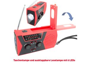 Radios Lifestyle Technik Audio Hifi Radios Radiorecorder - - Tragbares Solar-Kurbelradio mit 1W Taschenlampe, 6 LEDs Leselampe und Notfallalarm, wiederaufladbar, FM/AM Das tragbare Solar-Kurbelradio von X4-TECH ist perfekt für Outdoor-Aktivitäten, Camping und Notfallsituationen geeignet. Es bietet zuverlässigen Radioempfang und 2 fache Beleuchtungsmöglichkeiten. Mit einer klaren und kraftvollen Klangqualität, einem Gewicht von nur 300 g und seiner robusten Bauweise ist es leicht zu transportieren und langlebig. Die integrierte 1W Taschenlampe bietet Ihnen Beleuchtung in verschiedenen Stufen und kann einfach ein- und ausgeschaltet werden. Die ausklappbare Leselampe mit 6 LEDs sorgt für zusätzliche Flexibilität bei der Nutzung. Das Radio empfängt FM/AM/SW1/SW2 und verfügt über einen VOLUME-Regler, einen Radioband-Schalter und einen TUNING-Regler für eine einfache Bedienung. Ein 3,5-mm-Kopfhöreranschluss ermöglicht es Ihnen, ungestört Musik oder Nachrichten zu hören. Für die Stromversorgung stehen verschiedene Optionen zur Verfügung. Sie können den Akku des Radios über den USB-Anschluss, das Solarpanel aufladen oder das Radio mit AAA-Batterien betreiben. Im Notfall können Sie das Radio auch mit der Handkurbel betreiben und den Notfallalarm schnell aktivieren, um in Notsituationen auf sich aufmerksam zu machen. Im Lieferumfang sind eine Handgelenkschlaufe, ein USB-Ladekabel und eine Gebrauchsanweisung enthalten. Technische Daten Radio: Lautstärke: max. 100 dB Frequenzbereich: ... Das LogiLink Notfall Radio für 21,64 Euro überzeugt durch seine drei Lademöglichkeiten (Dynamo, Solar, USB) und die integrierte Taschenlampe. ![]() ![]() LogiLink Notfall Radio mit 3 Lademöglichkeiten: Dynamo-Handkurbel, Solarpanel und USB, mit integrierter Taschenlampe