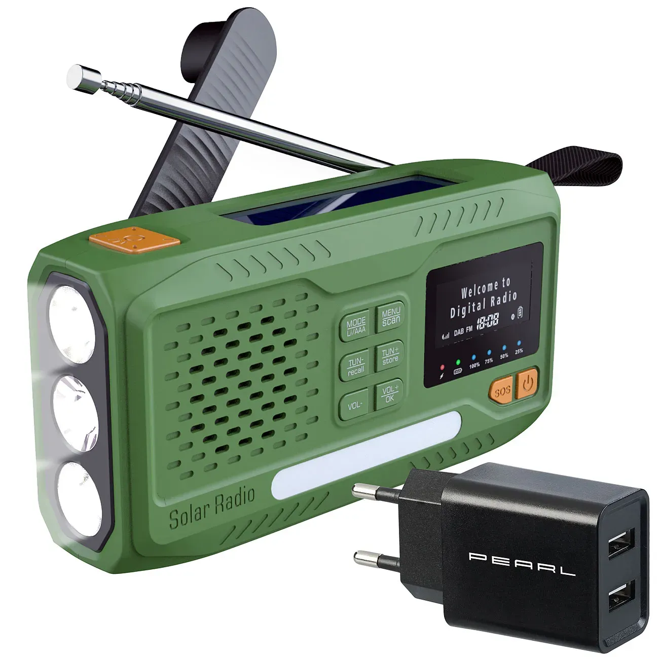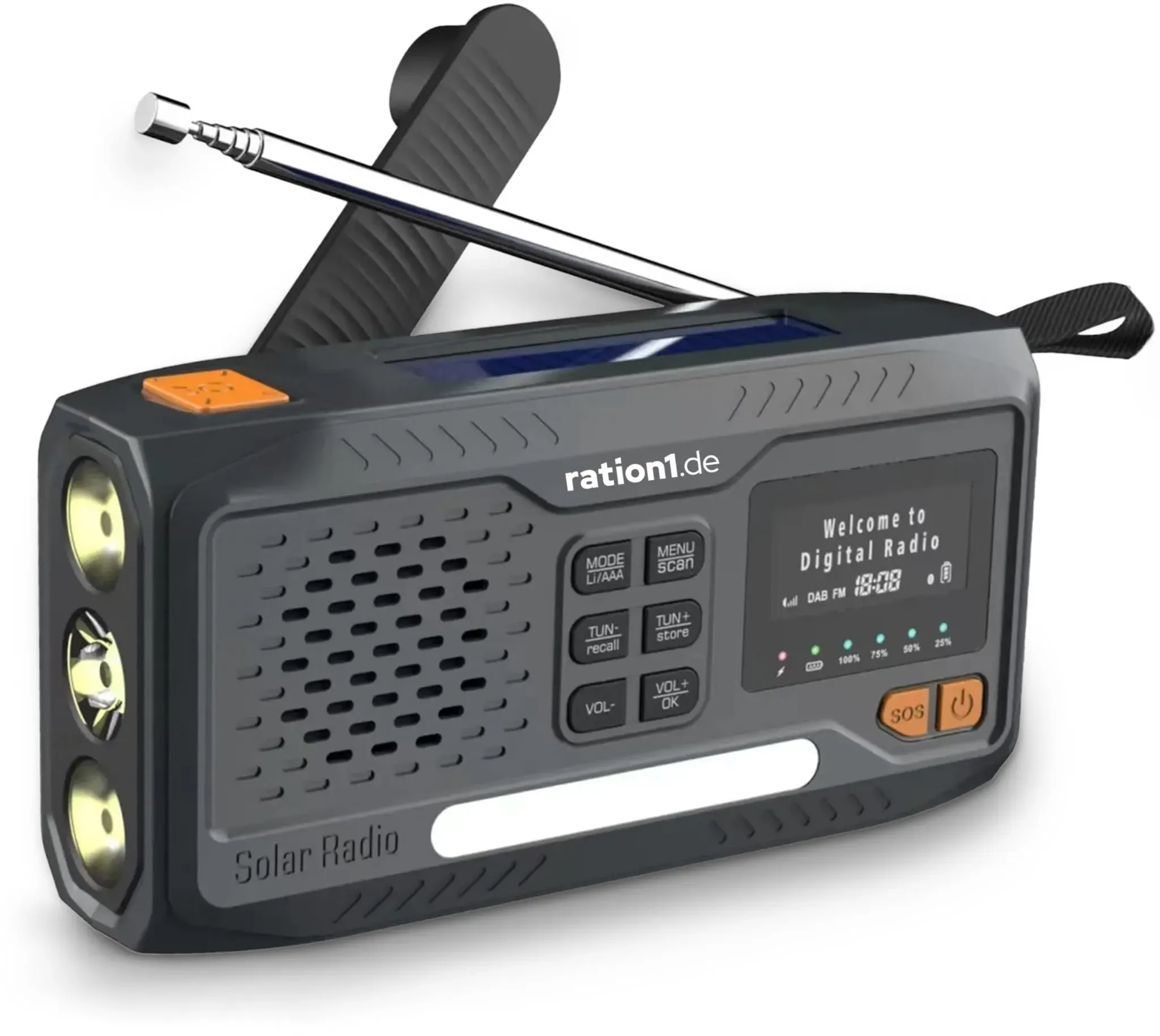 Kategorie: Radios - NEWTRO - GTIN:4260531670608 - DAB+/DAB/FM Radio Taschenlampe & Leselampe mit Notfall-Solarpanel Notfall-Powerbank zum Laden z.B. Ihres Mobiltelefons SOS-Alarm, Akku & Kurbel Ihr Multifunktionsbegleiter ideal für unterwegs mit XXL-Akku - 22,99 Euro bei Amazon Marketplace CE - gefunden von billiger.de Ein preiswertes Notfallradio mit DAB+, FM, Bluetooth und einem soliden 5000-mAh-Akku, ideal für den Blackout-Einsatz. ![]() DAB376BT Kurbelradio DAB+FM BT Notfallradio mit 5000-mAh-Akku Solar mit Wecker Handkurbel Blackout Notfallgebrauch