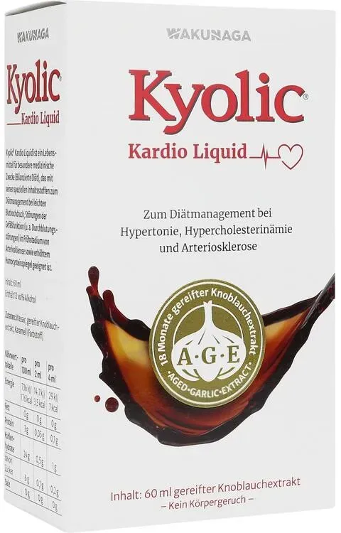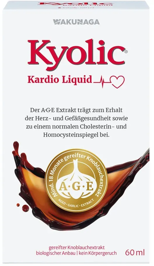 Verfügbarkeit: Lieferbar in 1-2 Werktagen - 298,67 €/l - Kategorie: Arzneimittel - WAKUNAGA of EUROPE GmbH - GTIN:4260730830018 - PZN:17550302 - KYOLIC Kardio LiquidBeschwerden und Komplikationen des Herz Kreislauf Systems gehören in Deutschland zu den häufigsten gesundheitlichen Problemen bei Männern und bei Frauen. Die Kyolic® Kardio Produkte bieten hierfür eine neue Perspektive, die wissenschaftlich sehr gut untersucht ist. Sie werden nach japanischer Herstellungsart in einem eigens entwickelten Verfahren produziert und erfreuen sich in Ländern wie den USA und Japan bereits seit vielen Jahrzehnten großer Beliebtheit. Erstmalig sind sie nun auch in Deutschland als Kapselvariante erhältlich. Das Besondere an Kyolic® ist der A·G·E Extrakt (A·G·E steht für Aged Garlic Extract). Dieser über 18 Monate gereifte, pflanzliche Extrakt ist reich an herz-und gefäßaktiven Cysteinen, wie z.B. S-Allylcystein (SAC), S 1 propenyl L cystein (S1PC) etc., die im SulfurCysteinComplex konzentriert vorliegen. Der A·G·E Extrakt leistet einen wertvollen Beitragzum Erhalt der Herz und Gefäßgesundheitzu einem normalen Cholesterinspiegelzu einem normalen Homocysteinspiegel A·G·E Extrakt: hochkonzentriert und kraftvoll.Der A·G·E Extrakt wird aus mindestens 18 Monate gereiftem Knoblauch gewonnen und extrahiert. Im Zuge des langen Reifungsprozesses erfolgt der Abbau der scharfen, geruchsbildenden und unverträglichen Substanzen (z. B. Alliin/ Allicin). Gleichzeitig reichern ... Dieses flüssige Kyolic-Produkt ist eine der günstigsten Optionen für Anwender, die eine flüssige Darreichungsform bevorzugen. ![]() ![]() WAKUNAGA of EUROPE GmbH Kyolic Kardio Liquid