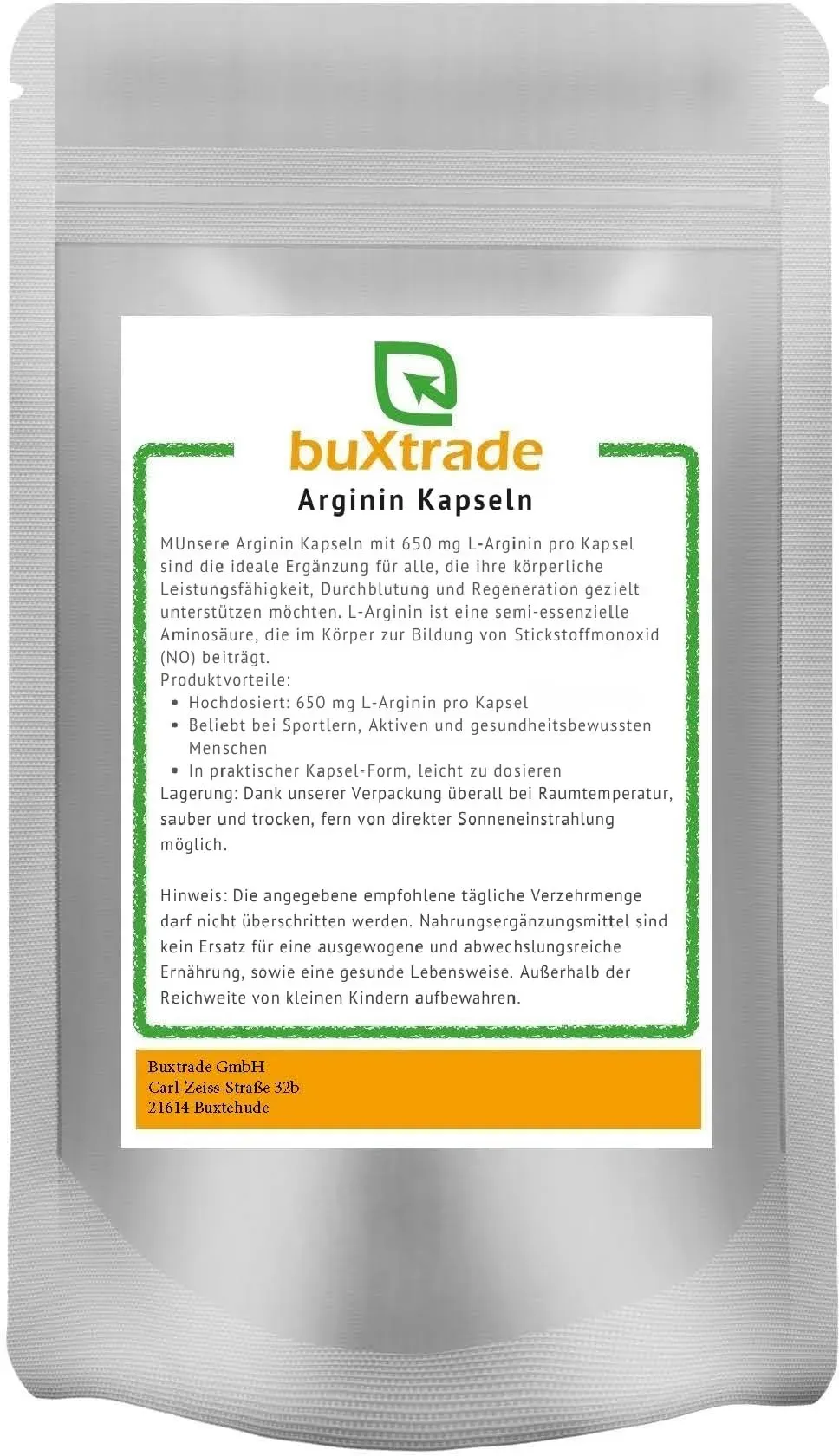 Kategorie: Sportnahrung - German Elite Nutrition - GTIN:0745572335210 - EXTRA HOCHDOSIERT: 380 Kapseln mit 6000 mg L-Arginin HCL (Hydrochlorid) pro Tagesportion (2 x 4 Kapseln), davon 4980 mg reines L-Arginin. PREMIUM-QUALITäT & PFLANZLICHE HERKUNFT: Unser reines L-Arginin wird durch aufwendige natürliche Fermentation gewonnen und stammt nicht aus Entenfedern oder anderen tierischen Quellen. 100 % pflanzlich und hochwertig verarbeitet. BEDEUTENDE AMINOSäURE: L-Arginin spielt eine zentrale Rolle im Aminosäurestoffwechsel und lässt sich hervorragend mit L-Citrullin, Taurin, L-Tyrosin, Beta-Alanin und AAKG kombinieren. OHNE UNERWüNSCHTE ZUSäTZE & VEGAN: Unsere L-Arginin Kapseln sind frei von Magnesiumstearat, Aromen, Farbstoffen, Stabilisatoren und Gelatine. Zudem sind sie ohne Gentechnik, laktosefrei, glutenfrei und ohne Konservierungsstoffe. Selbstverständlich sind die Kapseln vegan. VON SPORTLERN FüR SPORTLER: Unser Sortiment von German Elite Nutrition umfasst eine Vielzahl an Nahrungsergänzungsmitteln, hergestellt aus hochwertigen Rohstoffen, die dich bei deinen sportlichen Zielen unterstützen. Solltest du mit einem Produkt nicht zufrieden sein oder Beratung benötigen, stehen wir dir jederzeit zur Verfügung. - 24,99 Euro bei Amazon Marketplace Health & Personal Care - gefunden von billiger.de Hochdosiertes L-Arginin HCL in Kapselform, hergestellt in Deutschland und laborgeprüft, was für Qualität spricht. ![]() ![]() natural elements L-Arginin 365 Kapseln Hochdosiert: 4.500mg veganes L-Arginin HCL pro Tagesdosis (3.750mg reines L-Arginin) hochdosiert in Deutschland hergestellt & laborgeprüft