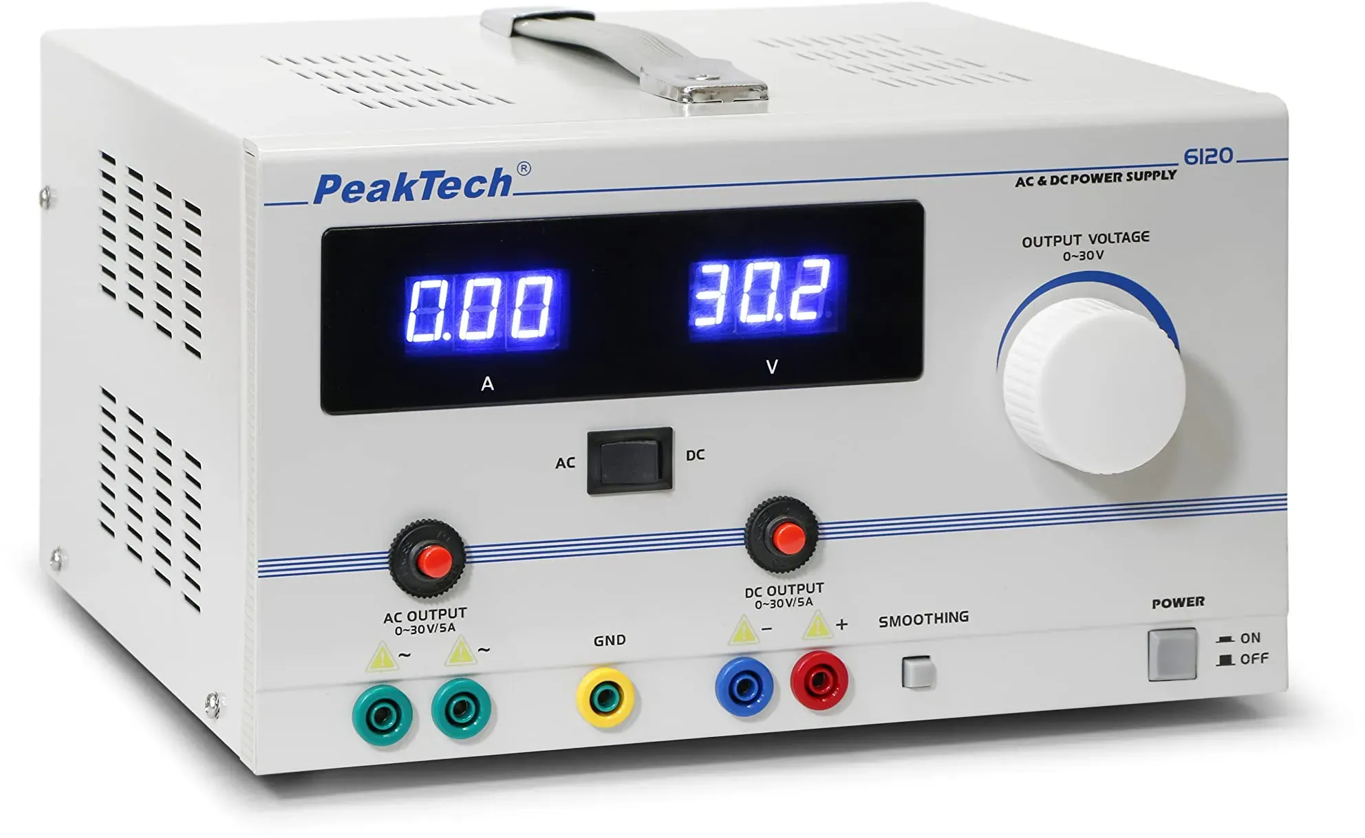 Verfügbarkeit: Auf Lager - Kategorie: Netzteile & Ladegeräte - jesverty - GTIN:0739807822392 - 1ï¸ÂģÂEncoder-Einstellknopf: Jesvertys SPS-H/HP 900W Serie Labornetzteil ersetzt traditionelle Potentiometer-Grob-/Feineinstellung durch Encoder-Knöpfe €“ so stellen Sie Spannung und Strom bequemer ein und steigern Ihre Arbeitseffizienz erheblich! (Einstellauflösung 0,01V/0,01A). 2ï¸ÂģÂAusgangs-An/Aus-Taste: Ein einfacher Druck auf die zusätzliche Ausgangstaste schaltet den Output mühelos ein/aus. Bei Einstellungen müssen Sie nicht mehr jedes Mal die Last entfernen oder das Gerät ausschalten! Auch keine Kurzschlussbrücke an den Ausgangsklemmen für Stromjustierungen mehr nötig! 3ï¸ÂģÂFunktionen & Schutz: OVP überspannungsschutz, OCP überstromschutz, temperaturgeregelter Lüfter. Zahlreiche praktische Funktionen in diesem kompakten Gerät! 4ï¸ÂģÂKompakt & Leicht: Jesvertys Elektronik-Netzteil wurde noch handlicher €“ mit nur 33,5(B)x21,3(H)x16,5(T)cm und ca. 3kg spart es wertvollen Arbeitsplatzraum. Ideal für Labor, Bildungseinrichtungen, Fabriktests, Wartungsarbeiten, Batterieladung, Eloxieren, Elektronik-Bastelarbeiten etc. 5ï¸ÂģÂLieferumfang & Service: 1x SPS-H/HP Gerät, 1x Netzkabel*, 1x Bedienungsanleitung. Wir bieten professionellen technischen Support. Bei Fragen zu Ihrer Bestellung kontaktieren Sie bitte ungeniert den Jesverty-Kundenservice per Amazon-Nachricht oder E-Mail📨. 🌟Hinweis: Netzkabel und ... Ein stabilisiertes Labornetzteil von Peaktech, das in Deutschland hergestellt wird und für professionelle Anwendungen mit hoher Zuverlässigkeit steht. ![]() ![]() Peaktech P6120 €“ Stabilisiertes Labornetzteil 0-30V / 0-5A AC/DC €“ Professionelles Labornetzgerät mit LED-Display €“ Liner regelbares Labor Netzteil €“ Made in Germany