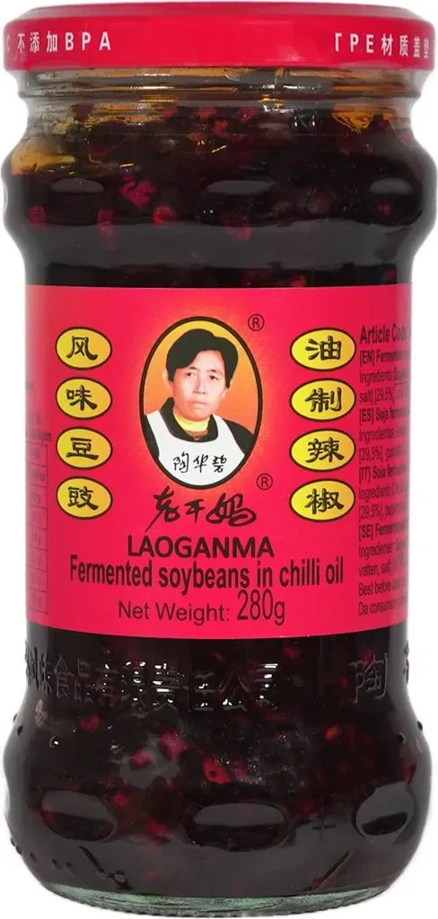 Kategorie: Würzsaucen - LAOGANMA - GTIN:6921804701808 - Lao Gan Ma Tomaten-Chili-Sauce 210 g: Diese dicke, scharfe Sauce besteht zu 55 % aus Tomaten und 30,5 % Chili und ist mit Knoblauch sowie Geschmacksverstärker (E621) angereichert. Sie ist eiweißreich, fettarm und ideal, um Mahlzeiten mit starkem Geschmack zu versehen. - 2,39 Euro bei Joybuy - gefunden von billiger.de Dieses Produkt bietet eine interessante Variante mit eingelegten schwarzen Bohnen in Chiliöl, ideal für Liebhaber herzhafter Aromen. ![]() ![]() LGM Marke Eingelegte Schwarze Bohnen in Chiliöl 280g Tao Huabi Lao Gan Ma Geschmack Schwarze Bohnen mit Chiliöl 280g