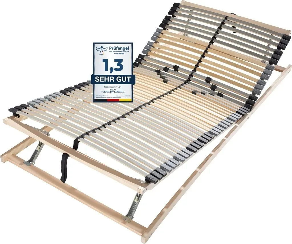 Zustand: Gebraucht - Lattenroste - Schlummerparadies - ckf-90x200 - EAN: 4250909601266 - stabiler Marken-Federholzrahmen: COMFORT 44 Vario, Kopf- und Fußteil verstellbar - für 90x200cm Betten, exaktes Maß: 89x196x7,5cm (BxLxH) LIEFERUNG: frei Bordsteinkante, fertig montiert MADE IN GERMANY: aus 100% Buchenholz, 7 Zonen System mit Schulterfräsung, 44 Federholzleisten, reißfester Mittelgurt, 9-fache Härteregulierung, Kopf- und Fußteilverstellung EXTREM STABIL: Bis 200Kg belastbar (inkl. Matratze), empfohlen/geprüft bis 140Kg, Triokappen vollständig holmüberdeckend (keine Besucherritze), Leistungsfähiges 7-Zonen-Wirksystem dank SCHULTERFRÄSUNG + 9-fache HÄRTEREGULIERUNG Unterstützt die Wirkung von 7-Zonen Matratzen 1 Hersteller (Bedingungen siehe Erklärung unterhalb der Beschreibung) - geprüfte Qualität von unabhängigen Prüfinstituten: Metallbeschläge von Hettich, 100€¯% Buchenholz (E05), geprüftes Qualitätsmanagement: SGS-zertifizierter Mittelgurthersteller (ISO€¯9001, DE23/00000267) sowie ISO€¯9001-zertifizierter Kautschuk-Kappen-Hersteller - 1 Händler im amazon.de Marketplace Der BeCo "Comfort Lux" mit 42 Latten und KF-Verstellung (Kopf- und Fußteil) bietet guten Komfort und Anpassungsmöglichkeiten. ![]() BeCo »Comfort Lux« 42 Lattenrost KF 90x200 cm