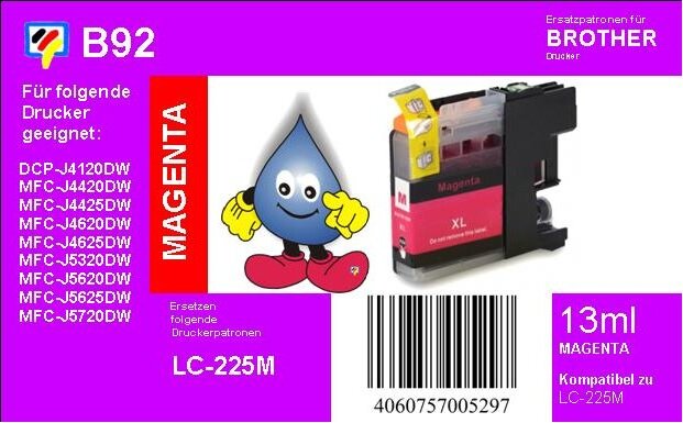EAN: 4042268111810 - Printation Tinte ersetzt Brother LC-225XLM, ca. 1.200 S., magentaBrother DCP: J4120DWBrother MFC: J4420DWJ4620DWJ4625DWJ5320DWJ5620DWJ5625DWJ5720DW - bei 22shop.de - aus Yadore Produktdaten Die Dr.Inkjet Ersatzpatrone ist eine sehr preiswerte Option mit einem guten Tintenvolumen. ![]() kaufland.d e Dr.Inkjet LC-225XLM - magenta - TiDis Ersatzpatrone mit 13ml Inhalt - ersetzt LC-225XLM B92