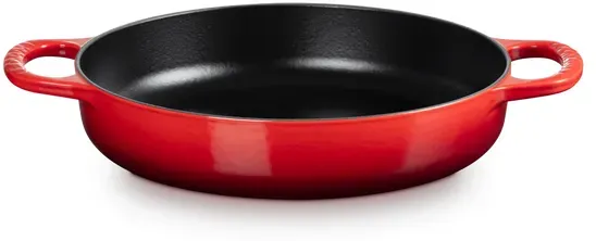Verfügbarkeit: 10 Tage - Kategorie: Pfannen - Le Creuset - GTIN:0024147335474 - Le Creuset Servierpfanne Signature mit zwei Griffen kirschrot Die emaillierte gusseiserne Signature Servierpfanne hat eine großzügige Tiefe und einen breiten Boden. Das macht sie ideal zum Braten, Schmoren, Köcheln von Saucen und mehr. Sie kombiniert die Vorteile eines Schmortopfs mit denen einer Bratpfanne und hat leicht gewölbte Seiten, die ein müheloses Umrühren ermöglichen. Die beiden großzügig dimensionierten Griffe sorgen für sicheren Halt. Le Creuset €“ weltweit und schon seit Generationen beliebt. Die Französische Traditionsmarke steht für Leistung, Haltbarkeit und markantes Design. Die Qualität in der Küche kommt nicht von ungefähr. Jedes Stück ist ein Unikat €“ handgefertigt in einer eigens gefertigten Gussform aus Sand, die nach der Herstellung zerstört wird. Nach dem Guss wird jedes Teil per Hand weiter bearbeitet. 15 Spezialisten begutachten es im Laufe seines Herstellungsproz... - 229,00 Euro bei grimm-daheim - gefunden von billiger.de Eine hochwertige Sautepfanne mit Holzgriff, die für schonendes Braten und Schmoren ideal ist und eine edle Optik besitzt. ![]() ![]() Le Creuset Sautepfanne mit Holzgriff 28 cm kirschrot