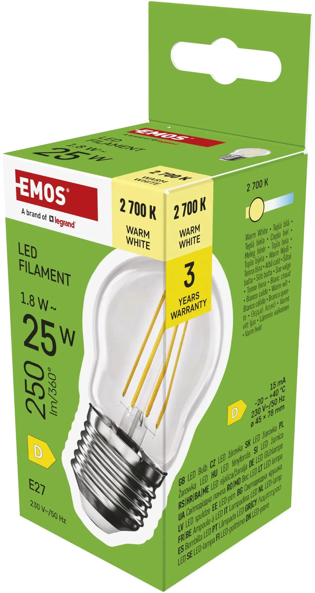3 Händlerangebote bei billiger.de - EEK: D - Kategorie: LED-Lampen - EMOS - FILAMENT: Diese Design-Lampe mit durchsichtigem Glaskolben in der Form einer kleinen Kugel verleiht Ihrem Zuhause einen Retro-look kombiniert mit Energieeffizienz der modernen und sparsamen LED-Technologie (Energieeffizienzklasse D) HOCHWERTIG: Die klare LED-Filamentbirne enthält hochwertigen und hocheffizienten COB LED Chips und spendet ein sanftes, warmweißes Licht von 2.700 Kelvin mit dem Lichtstrom von 250 Lumen. Extra breiter Abstrahlwinkel von bis zu 360 Grad UNIVERSAL: Einfache Montage dank dem am häufigsten vorkommenden E27-Lampensockel. Das amgenehme, warme Licht der runden Birne sorg für die entspannte Stimmung und behagliche Atmosphäre in Ihrem Zuhause, Caf , Hotel, Bar etc. SPARSAM: Diese stark energiesparende 1,8 Watt LED-Fadenlampe in MiniGlobe-Form ersetzt die herkömmlichen 25 Watt starken Glühbirnen. Hohe Farbwiedergabe (CRI 80) spricht für lebhafte und unverfälschte Farben LANGLEBIG: Lebensdauer bis zu 25 000 Stunden Betriebsdauer spricht für einen langlebigen Dienst - GTIN:8592920130407 Dieses Angebot ist mit 1,82 Euro das günstigste Einzelprodukt und somit ideal für preisbewusste Käufer. ![]() ![]() LEDVANCE LED CLASSIC P P 2.5W 827 mattiert E27