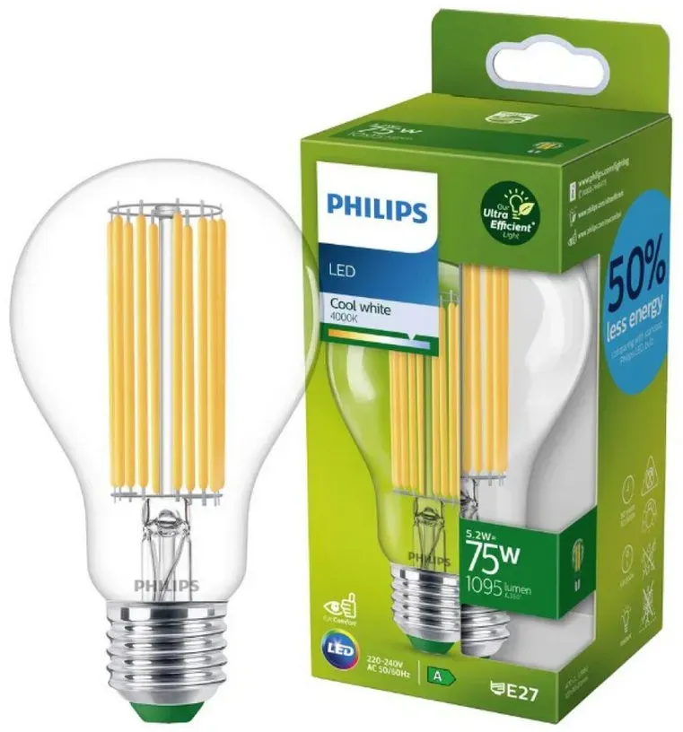 lieferbar-in 3-4 Werktagen bei dirPhilips LED-Leuchtmittel LED E27 A70 Filament Klar 5,2W = 75W ULTRA EFFIZIENT 1095lm Kalt 4000K, E27, Kaltweiß, Filament klar weiß