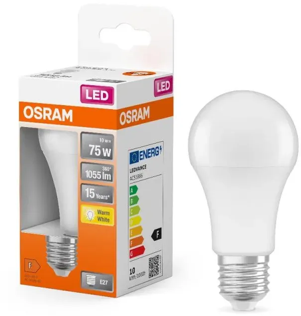 LED-Lampen Glühbirnen - EAN:4058075122529 - Auf der Suche nach der Erleuchtung? - Die OSRAM LED-Lampe STAR CLASSIC A 75 E27 10 W matt hilft!Tauchen Sie Ihre Räume mit der OSRAM LED-Lampe STAR CLASSIC A 75 E27 10 W matt in das für Sie optimale Licht! Dieses Modell leuchtet Ihre Räumlichkeiten stets ideal aus und ist dabei besonders energiesparend. Die OSRAM LED-Lampe STAR CLASSIC A 75 E27 10 W matt kommt in folgender Ausführung zu Ihnen: matt.Wissenswertes zur LED-TechnologieDie LED-Technologie, mit der das Modell betrieben wird, hat u.a. diese Vorteile:Hohe EnergieeffizienzStoßunempfindlichLange LebensdauerEnthält keine giftigen SubstanzenSo lange hält die OSRAM LED-Lampe STAR CLASSIC A 75: 15.000 Stunden.10 W Leistung bringen Leuchtkraft von herkömmlichen 75 W!Der Lampensockel weist die Größe E27 auf und ist für alle entsprechenden Fassungen geeignet. Herkömmliche Birnen mit 75 W Leistung lassen sich ganz einfach mit diesem sparsamen 10-W-Modell ersetzen.Wie sieht es mit dem Energieverbrauch aus?Der errechnete Energieverbrauch bei 1000 Stunden Brenndauer - das entspricht ca. einer Nutzungszeit von - hilft dabei einzuschätzen, wie viel Strom Sie benötigen. Er beträgt 10 kWh/1000h. Dadurch ist das Modell der Energieeffizienzklasse F zugehörig.Passt die Farbtemperatur zu Ihren Bedürfnissen?Wussten Sie, dass man die Lichttemperatur in Kelvin misst? Je höher der Kelvin-Wert, desto bläulicher (kälter) ist das Licht, je niedriger, desto wärmer. Bei diesem Exemplar sind es ... Ein sehr günstiges Angebot für eine LED-Lampe mit neutralweißem Licht, die eine 75-W-Glühbirne ersetzt. Manomano.d e
