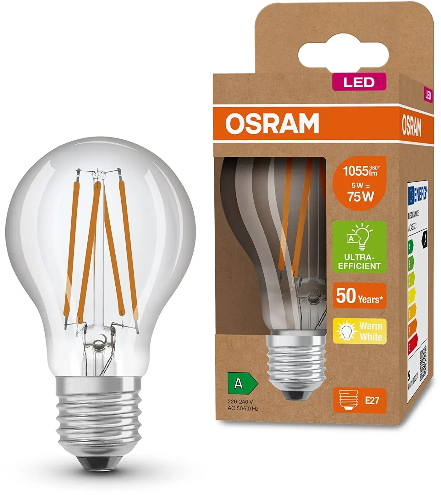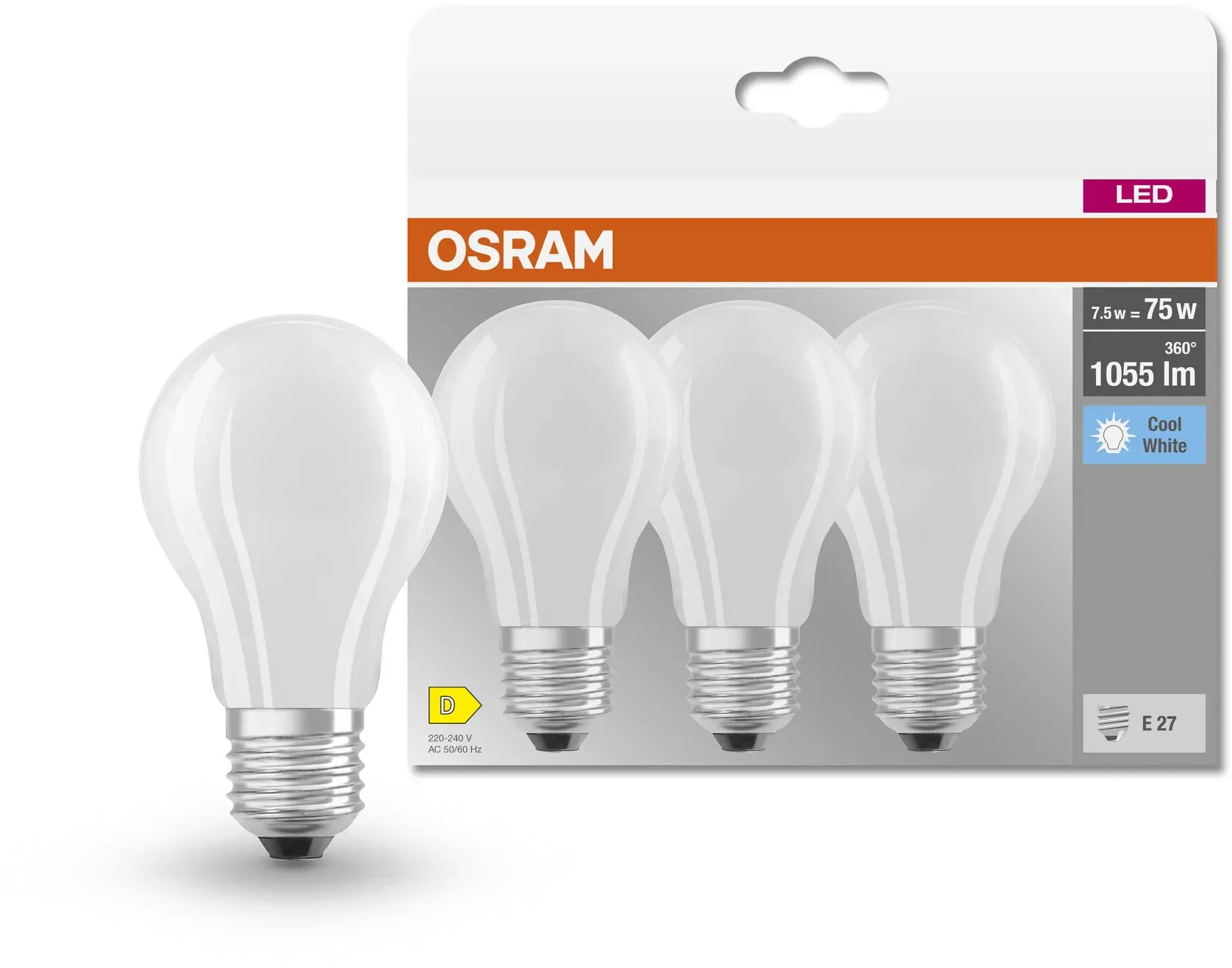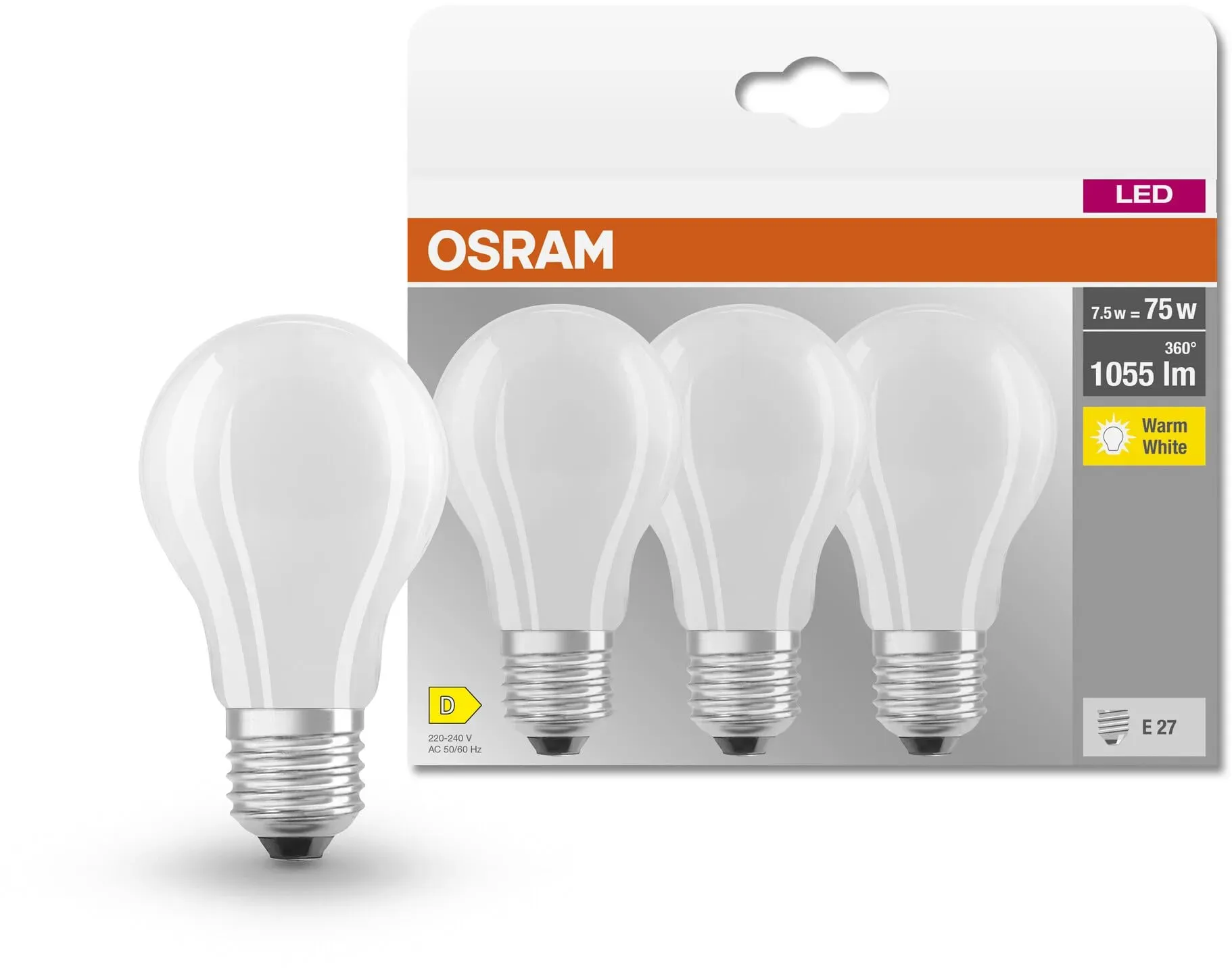 7 Händlerangebote bei billiger.de - EEK: D - Kategorie: LED-Lampen - Osram - Professionelle LED-Lampen für Netzspannung Nicht dimmbar Sockel: E27, B22d Quecksilberfreie Lampen Sehr geringer Energieverbrauch - GTIN:4058075592476 Dieses 3er-Pack von Osram bietet warmweißes Licht und ist ideal für eine gemütliche Atmosphäre. ![]() ![]() Osram LED BASE Classic A75, matte Filament LED-Lampen aus Glas für E27 Sockel, Birnenform, Warmweiß (2700K), 1055 Lumen, Ersatz für herkömmliche 75W-Glühbirnen, 3er-Box