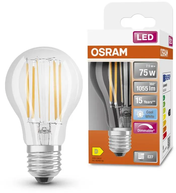 Sofort lieferbar | in 1-3 WerktagenOSRAM LED Lampe E27 in Glühlampenform FILAMENT klar dimmbar 7,5W wie 75W neutralweiße Beleuchtung