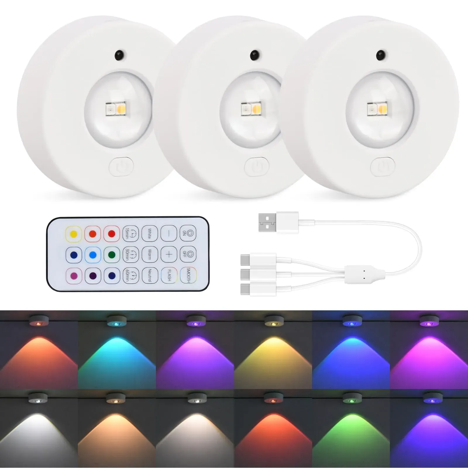 Auf Lager Versand durch AmazonRGB LED Spot Akku mit Fernbedienung, 2400mAh USB Aufladbar Vitrinenbeleuchtung Kabellos Unterbauleuchte Küche Rund Schrankleuchte Magnet Klebeleuchte Farbwechsel Spotlight für Schrank Regal Vitrine