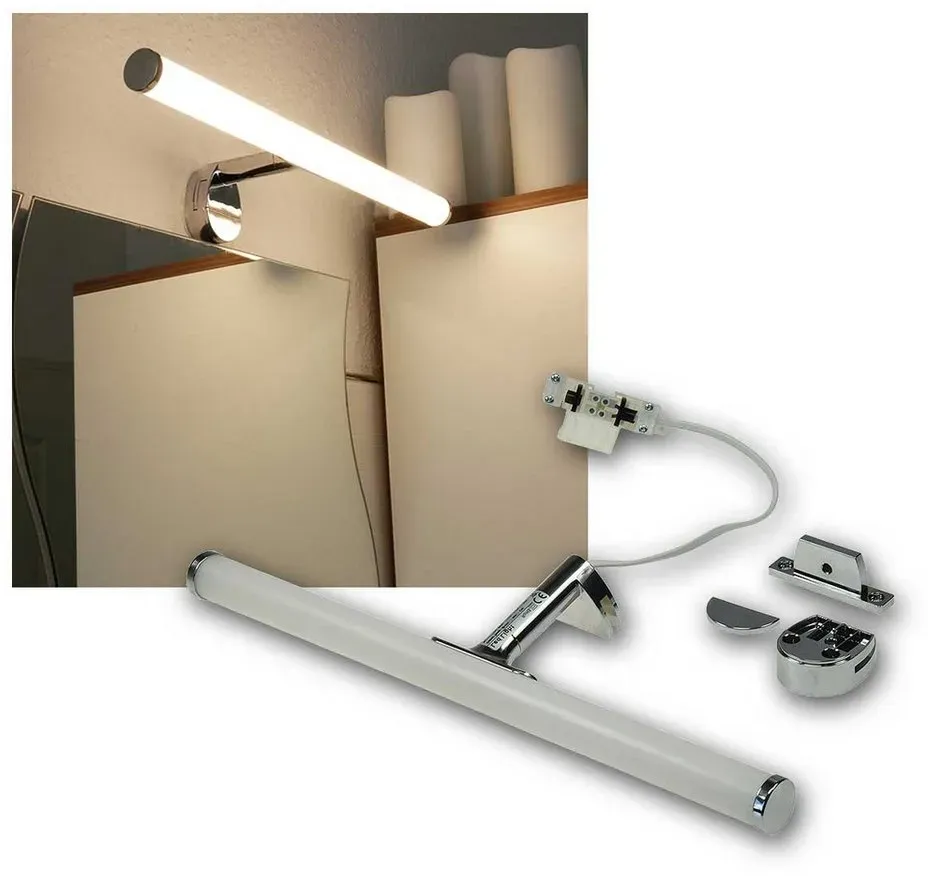 Zustand: Neu - Spiegellampen Spiegellampen für das Bad - BRILONER Briloner Leuchten - 2117014 - EAN: 4002707444251 - Die Badezimmer Spiegellampe aus Kunststoff in chrom matt ist die ideale Beleuchtungslösung für Ihr Badezimmer. Ein neutralweißes Licht von 4000 Kelvin bietet eine perfekte Lichtfarbe für die Hygiene Mit ihren Maßen von 600x65x45mm (LxHxB) hat sie eine sehr gute Größe. Zudem bietet die Badezimmerlampe ausreichenden Schutz vor Feuchtigkeit und Spritzwasser durch ihre IP44-Schutzart Die, bei der LED Lampe bereits im Lieferumfang enthaltene, LED-Platine verfügt über starke Leistung von 9 Watt und 920 Lumen und eine lange Lebensdauer von 25.000 Stunden Als LED Wandlampe neben oder über Ihrem Spiegel und Spiegelschrank montiert, ist die LED Spiegelbeleuchtung im Badezimmer eine großartige Wahl für eine langlebige und energieeffiziente Beleuchtung Bei diesem Produkt handelt es sich um ein umgebendes Produkt. Umgebende Produkte sind Leuchten, die zur separaten Überprüfung der enthaltenen Lichtquelle(n) zerlegt werden können. Dieses Produkt enthält eine Lichtquelle der Energieeffizienzklasse F - bei Amazon.de Die ChiliTec LED-Spiegelleuchte Banheiro ist eine sehr günstige und funktionale Option für grundlegende Beleuchtungsbedürfnisse. ![]() ![]() ChiliTec LED-Spiegelleuchte Banheiro 6A , EEK: E, 230V, 6W, 540lm, 400 mm