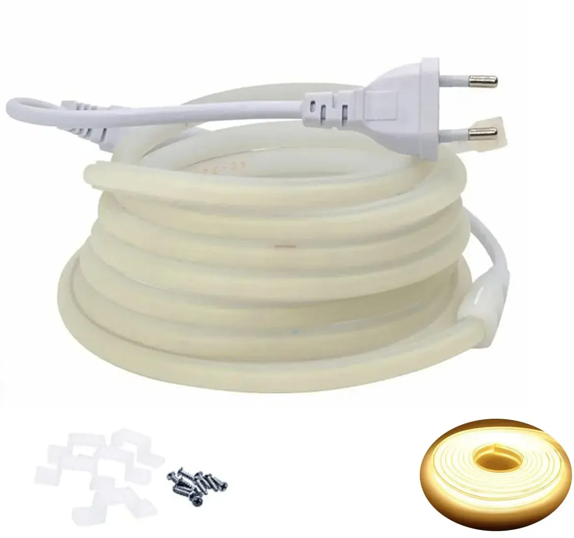 EEK: F - Kategorie: LED-Lampen - kisufu - COB-Hochspannungs-Lichtleiste: Dies ist eine COB-Hochspannungs-Lichtleiste, hohe Helligkeit, kein dunkler Bereich, stabile Arbeit, geeignet für die Arbeit Dekoration. 1 Stecker kann bis zu 50 Meter tragen, Leistung 7-9W/M, AC 220V LED Cob Lichtleiste ist wasserdicht und hitzebeständig. Das Material ist frei von Schadstoffen, sicher und zuverlässig. 360 LEDs pro Meter. Gleichmäßige Lumineszenz, weiches Licht, keine Blendung, keine Augenschäden, hohe Zuverlässigkeit, kein totes Licht, keine dunklen Flecken. Hoher Farbwiedergabeindex (CRI 85Ra), hohe Lichtausbeute. Größe: 13 mm x 7 mm. Schneiden Sie alle 50cm.(Wasserdichte Maßnahmen sollten für die Verdrahtung Position und LED-Streifen Schwanz genommen werden). Flexible DIY: Kompakte und flexible LED-Streifen können frei gebogen oder zu Mustern verschiedener Formen gemacht werden. (Hinweis: biegbar, aber bitte nicht überbiegen, um Schäden zu vermeiden) LED-Lichtstreifen sind die perfekte Wahl für Haus- und Gebäudedekoration. Sie verleihen auch Weihnachten, Partys, Geburtstagen, Hochzeiten, Banketten und anderen Veranstaltungen eine romantische und magische Farbatmosphäre. Sichere und breite Anwendung: abgesicherte Steckdose für überstromschutz. Ohne selbstklebendes Band. Kann mit Clips und Schrauben installiert werden (Wohnzimmer, Küche, Wohnzimmer, Esszimmer, Schlafzimmer, Party, Treppenhaus, Hochzeit, Bar usw.) - 14,99 Euro bei Amazon Marketplace Home - gefunden von billiger.de Dieser KISUFU LED Lichtschlauch für 16.99 Euro ist wasserdicht und eignet sich hervorragend für die Außen- und Gartendekoration. ![]() ![]() KISUFU 3M LED Strip Rope Lights,220V LED Lichtschlauch Außen,240 LEDs/m Indoor Warmweiß LED Fairy Lights for Garden Decoration,Outdoor LED Lichter Wasserdicht LED Tube