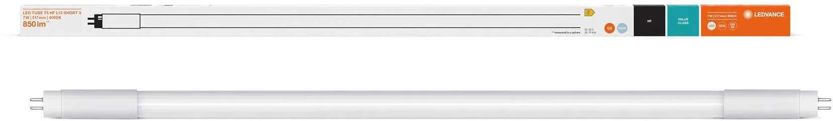 LED-Lampen Licht Leuchtmittel LED-Lampen LED Leuchtröhren Sockel G5 Glühbirnen - EAN:4058075823655 - LED-Röhren für elektronische Vorschaltgeräte (EVG), Splitterschutz. Produkteigenschaften: Retrofit-Ersatz von bestehenden T5-Lampen an HF-Vorschaltgeräten, Lampenröhre aus Glas mit Splitterschutz, Hohe Farbkonsistenz: ‰¤ 5 SDCM (Schwellwerteinheit), Lebensdauer: bis zu 30.000 h, Flimmerarm nach EU 2019/2020 (SVM ‰¤0,4 / PstLM ‰¤ 1), Schutzart: IP20, Kompatibel mit vielen handelsüblichen elektronischen Vorschaltgeräten (siehe auch Kompatibilitätsliste), Produktvorteile: Kein Durchhängen dank Glastechnik, Einfacher, schneller und sicherer Lampenaustausch ohne Umverdrahtung, Auch geeignet für den Betrieb bei niedrigen Temperaturen, Beachten Sie bitte alle Sicherheitshinweise, Anwendungsgebiete: Allgemeinbeleuchtung in Umgebungstemperaturen von -20€¦+45 °C, Öffentliche Gebäude, Küchen, Unterbaubeleuchtung, Technische Daten: Länge: 530 mm, Breite: 18,50 mm, Höhe: 18,50 mm, Durchmesser: 18,50 mm, Nettogewicht: 68 g, Sockel: G5, Nennspannung: 55 V, Nennstrom: 215 mA, Bemessungsleistung: 7 W, Energieverbrauch: 7 kWh/1000, Farbtemperatur: 3000 K, Lichtfarbe: Warm weiß, Abstrahlwinkel: 190°, Lichtstrom: 770 lm, Lichtausbeute: 110 lm/W, Farbwiedergabe: 80 CRI, Lebensdauer: 30000 h, Schaltzyklen: 200000, Energieeffizienzklasse: F, Material: Glas mit Splitterschutz, Farbe: Weiß, EAN: 4058075823655 - gefunden von Kelkoo Ltt- versand.de Ledvance Led-Röhre T5 Hf Short V 517 Mm 7w 840