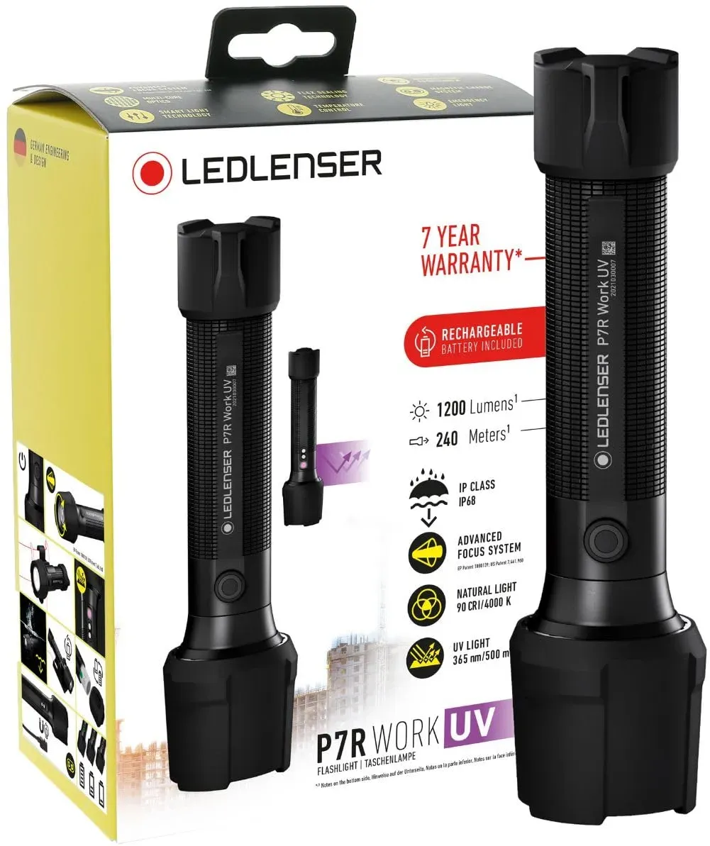 Kategorie: Taschenlampen - Ledlenser - GTIN:4058205037136 - Die leistungsstarke P7R Pro von Ledlenser leuchtet zuverlässig sowohl grosse Bereiche als auch kleine Projekte aus und kommt mit einer komfortablen Fokusfunktion. Das natürliche Weisslicht mit hohem Farbwiedergabeindex (CRI 80) schont deine Augen, sodass du auch lange Schichten durchhältst. Per Mode Select Ring kannst du mühelos zwischen verschiedenen Lichtfunktionen, dem USB-C-Ladeport und der Transportsperre wechseln. Damit die P7R Pro auch herausfordernden Arbeitsumgebungen standhält, ist sie mit abnehmbaren Schutzkappen ausgestattet und extrem vor Staub und Wasser geschützt. Alle Aluminiumkomponenten des hochwertigen Gehäuses sind aus 75 % recyceltem Material gefertigt. bei Registrierung. Gewicht mit Akku: 223 g. Länge: 170 mm. Farbe: schwarz. Leistung Boost: bis 2000 lm, 320 m. Power: 1200 lm, 240 m. Leuchtdauer: bis 60 h bei 25 lm. Funktionen: Boost, Power, Mid, Low, SOS, Strobe, Blink, Position. Mit mechanischer Transportsicherung. Mit Fokus, Frontschalter und Auswahlring. Li-Ion-Akku (1x21700, 4600 mAh, 16.56 Wh). Lieferumfang: Akku, Ladestation, USB-C-Kabel, Schutzkappen, Handschlaufe. Schutzklasse: IP68. - 114,88 Euro bei Galaxus.de - gefunden von billiger.de Die Ledlenser P7R Work UV ist eine spezialisierte Taschenlampe mit UV-Lichtfunktion, perfekt für Fleckenerkennung und Inspektionsaufgaben. ![]() ![]() Ledlenser P7R Work UV - LED Wiederaufladbar mit Hilfs-UV-Taschenlampe, Superhell 1200 Lumen, Wasserabweisend, Fleckerkennung, UV-Taschenlampe 365nm, Professionelle Suchscheinwerfer-Taschenlampe, bis