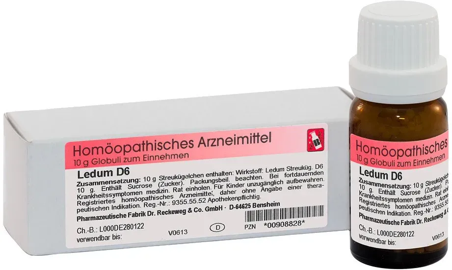 Zustand: Neu - 2.875,00 € / kg - Homöopathische Einzelwirkstoffe - Pittroff Apotheke - Pittroff-8014912 - - Röhrchen gefüllt mit Globuli Einzelmittel - ideal zur Aufbewahrung in der Homöopathie Hausapotheke, Taschenapotheke & Reiseapotheke Abfüllung Original Globuli der Firma DHU-Arzneimittel GmbH & Co. KG Qualitätsmanagementsystem der Apotheke nach ISO 9001:2015 Zu Risiken und Nebenwirkungen lesen Sie die Packungsbeilage und fragen Sie Ihren Arzt oder Apotheker Aufgrund spezieller Abfüllung vom Umtausch und fernabsatzrechtlichen Widerrufsrecht ausgeschlossen - Verkäufer: pitapo im amazon.de Marketplace Ein besonders preiswertes Angebot für Ledum D6, das sich für den Einstieg eignet. ![]() ![]() Dr.RECKEWEG & Co. GmbH Ledum D6
