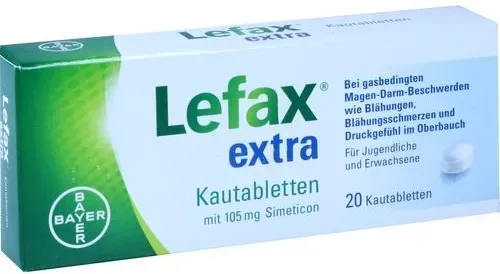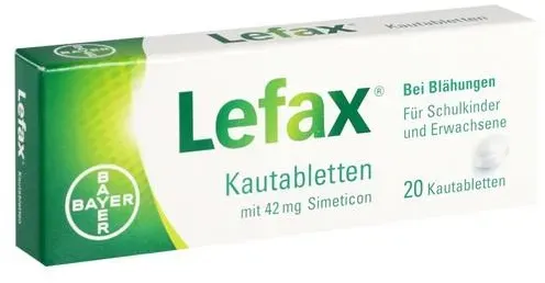 0.22 / 1 ct - Kategorie: Arzneimittel - Bayer - GTIN:4150024879406 - PZN:02487940 - 02487940: Bayer Vital GmbH Geschäftsbereich Selbstmedikation - LEFAX Kautabletten 20 St - 4,42 Euro bei ayvita.de - gefunden von billiger.de Diese Lefax extra Kautabletten sind eine günstige Option für die schnelle Linderung von Blähungen. ![]() ![]() Bayer LEFAX extra Kautabletten 20 St