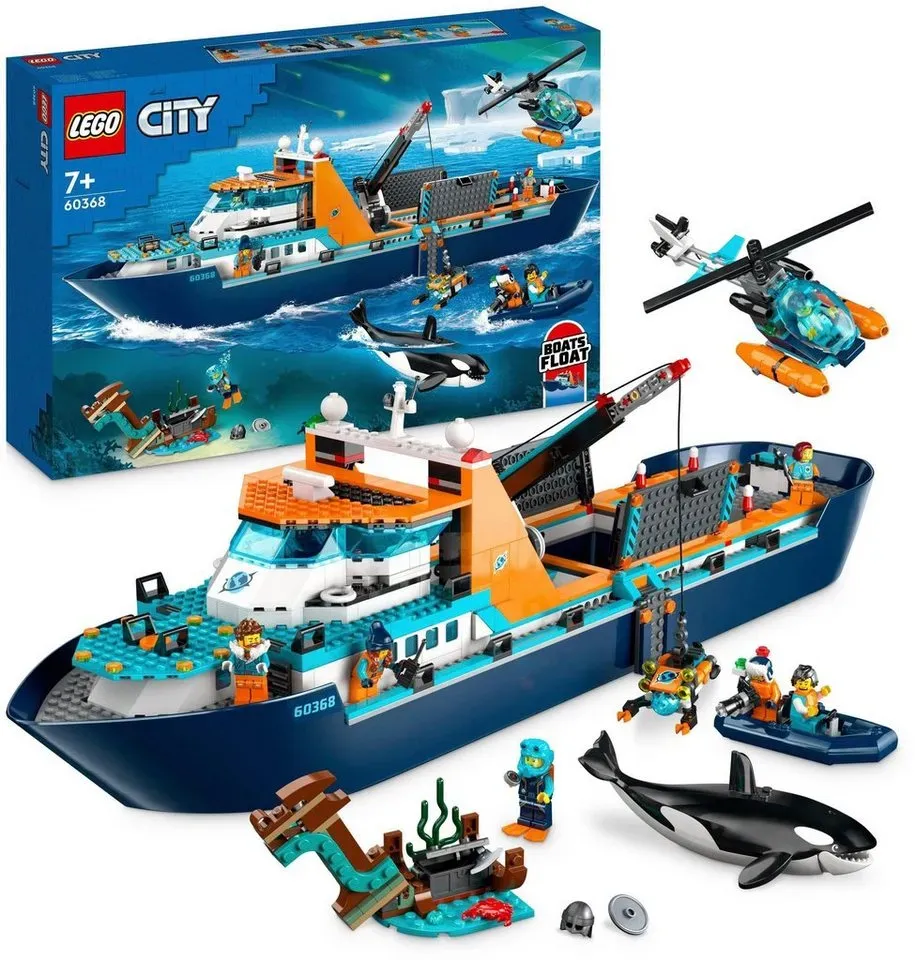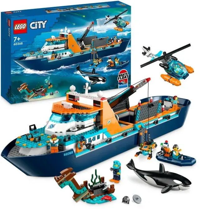 Auf Lager Versand durch AmazonLEGO City Arktis-Forschungsschiff, großes schwimmfähiges Spielzeug-Boot mit Hubschrauber, Beiboot, ROV-U-Boot, Wikingerschiffswrack, 7 Minifiguren & Orca-Figur, Geschenk für Kinder ab 7 Jahren 60368