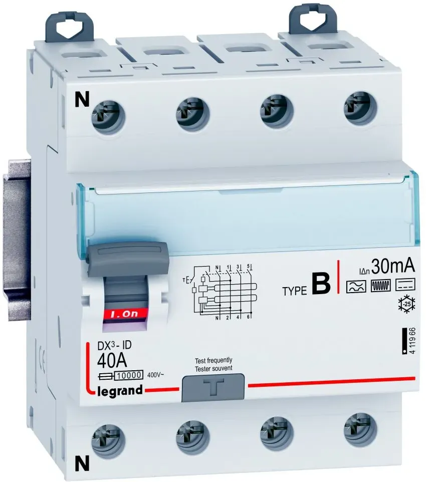 8 Händlerangebote bei billiger.de - Kategorie: Sonstige Elektroinstallationsartikel - Legrand - Legrand Fehlerstromschutzschalter DX3-ID, Typ B, allstromsensitiv, für Wechsel-, pulsierende und glatte Gleichfehlerströme, nach VDE 0664-10, VDE 0664-11, VDE 0664-40, EN 61008-1, EN 61008-2-1, EN 62423, Erfassung von Fehlerströmen im Frequenzbereich 0 Hz bis 1kHz, kurzzeitverzögert, mit hoher Auslöseschwelle für erhöhte Betriebssicherheit (vermindert Fehlauslösungen), 4-polig, Bemessungsstrom In 40 A, Bemessungsfehlerstrom Idn 30 mA, Bemessungsspannung Un 400 VAC, Bemessungsfrequenz 50 Hz, Bemessungskurzschlussstrom 10 kA bei geeigneter Vorsicherung, Stoßstromfest bis 3000 A, 4-modulig, Befestigung auf Hutprofilschiene EN 60715 durch Schnellbefestigung, klare Information vorne auf jedem Gerät, eindeutige Schaltstellungsanzeige rot/grün am Schalthebel, mit Beschriftungsfenster, mit Untersteckschutz zum sicheren Einführen des Leiters in Fahrstuhlklemme, Anbau von Hilfsgeräten möglich. Neutralleiter-Anschluss links. Einsatz und Verwendung von allstromsensitive Fehlerstromschutzschaltern für gewerbliche und industrielle Installationen mit TT, TN-S und TN-C-S Systemen, in denen Betriebsmittel der Leistungselektronik ohne galvanische Netztrennung zur Anwendung kommen, wie zum Beispiel Anlagen mit Frequenzumrichtern. Anwendungsbereiche sind: Photovoltaik-Anlagen/ Pumpen-, Klima- und Lüftungsanlagen/ Rolltreppen und Fahrstuhlanlagen/ Medizinische Geräte/ Schweißanlagen/ USV-Anlagen/ ... ![]() ![]() Legrand DX3 Fehlerstromschutzschalter 40A (411966)