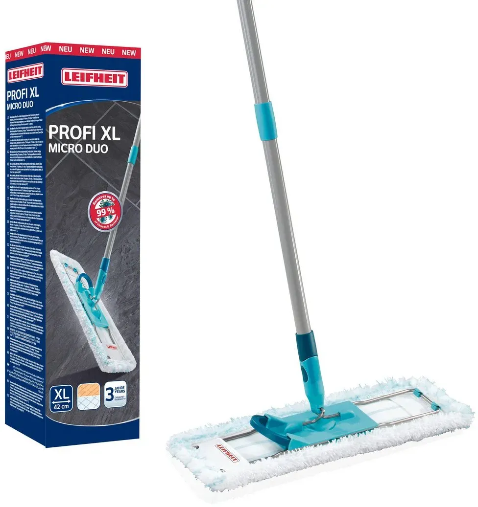 29 Händlerangebote bei billiger.de - Kategorie: Sonstige Reinigungsgeräte - Leifheit - Schluss mit Rückenschmerzen beim Putzen und unschönen Schlieren. Der Leifheit Profi XL micro duo entfernt mit seinem speziellen 2-Faser-Wischbezug auch hartnäckigen Schmutz und lässt sich ganz bequem per Fuß bedienen. So sieht der ideale Bodenwischer für große Flächen, wie Küchen oder auch Büroräume, aus. Der 2-Faser-Wischbezug besteht aus der bewährten Leifheit Microfaser Duo. Reihen von feinsten, leicht erhöhten Borsten reichen bis in kleinste Vertiefungen hinein und entfernen auch hartnäckigen Schmutz ohne Kraftanstrengung. Mit seiner stattlichen Wischbreite von 42 cm spart der Profi micro duo viele Arbeitsschritte und wertvolle Zeit. Das geniale, rundum bewegliche 360 -Drehgelenk ermöglicht ein effektives Reinigen in Schlangenlinien und umkreist geschickt Tisch- und Schrankbeine. Durch den komplett abwinkelbaren Stiel sind auch schwer zugängliche Stellen unter Schränken und Betten leicht zu erreichen. Bedienen lässt sich der Bodenwischer ganz bequem im Stehen: Einfach per Fußklick den Wischüberzug lösen, in der separat erhältlichen Leifheit Wischtuchpresse Profi XL auspressen, Bezug wieder einspannen, fertig. - GTIN:4006501550453 Ein ergonomischer Bodenwischer mit Micro Duo Bezug, der eine streifenfreie Reinigung verspricht. ![]() ![]() Leifheit Bodenwischer Profi XL Micro Duo, Silber, Türkis, Kunststoff, 42x146x15 cm, ergonomischer Griff, rutschfester flexibler Schwenkhals, hohe Saugfähigkeit, streifenfreie Reinigung, Haushaltsreinigung, Wischen & Reinigen