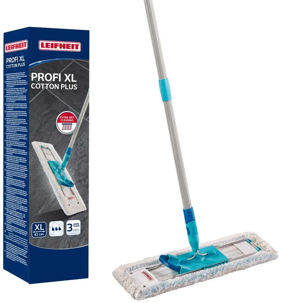 Zustand: Neu - Nass- & Trockenmopps Nass- & Trockenmopps für den Haushalt - Leifheit Leifheit AG - 55457 - EAN: 4006927077817 EAN: 4006501554574 - Click-System - Der Bodenreiniger verfügt über das patentierte Leifheit Click-System: dank speziellem Aufsatz sind verschiedene Reinigungsgeräte in Kombination mit dem Stahlstiel möglich Schont den Rücken - Mit dem Bodenwischer Profi wird der Rücken nicht belastet, denn er lässt sich ohne Bücken per Fußklick bedienen; geeignet für die separat erhältliche Wischtuchpresse Cleverer Stiel - Der Schrubber mit Stiel 146 cm aus hochwertigem Stahl besitzt eine Wischbreite von 42 cm und ein 360 Grad Drehgelenk, sodass ein bequemes Wischen in kurzer Zeit möglich ist Nebeltrocken wischen - Mit nur minimaler Wasseraufnahme ist der Wischbezug für empfindliches Parkett, Laminat und Kork; auch als Fliesenwischer ist er verwendbar Umweltfreundliche Verpackung - dank des stabilen 3-teiligen Stiels, benötigt der Wischmop 40 Prozent weniger Verpackung als sein Vorgänger und reduziert folglich den Verpackungsmüll Lieferumfang - Leifheit Bodenwischer Profi XL super soft, 3-tlg. Stahlstiel 146 cm (Demontage nach Aufbau nicht mehr möglich), Wischbezug 100% Polyester, umweltfreundliche Verpackung, Art. Nr. 55457 - bei Amazon.de Dieser Bodenwischer mit Cotton Plus Bezug ist ideal für eine gründliche Reinigung und verfügt über das praktische Click-System. ![]() ![]()