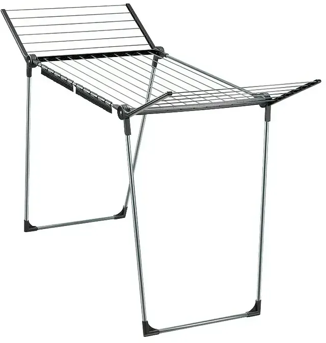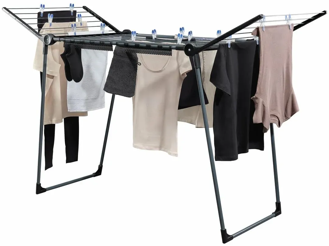 Kategorie: Wäscheständer - Leifheit - GTIN:4006501815897 - Mit Flügeln - Durch die 1,05 Meter hohen Flügel ist dieses flach verstaubare Wäschegestell zum Trocknen langer Wäschestücke, wie z. B. Hosen oder Badehandtücher geeignet Stabil und Standfest - Der Leifheit Wäschehänger steht mit parallelen, rutschsicheren Standbeinen windfest und stabil; 1-2 Wäscheladungen finden auf dem Gestell Platz Auch für draußen - Mit seinen rostfreien, pulverbeschichteten Trockenstäben eignet sich der Wäschetrockner nicht nur für Innenräume sondern auch für den Balkon oder Garten 18 Leinenmeter - Ganze 18 Meter Trockenleine bieten viel Raum zum Wäsche aufhängen - für 1-2 Waschmaschinenladungen; an den 2 Kleinteilehaltern können Socken oder Slips platzsparend befestigt werden Lieferumfang - Leifheit Pegasus 180 Solid schwarzer Flügelwäscheständer 157 x 66 x 87 cm, aus Aluminium und Kunststoff, rostfrei, Made in Europe, 2 Kleinteilehalter, Art Nr 81589 - 39,99 Euro bei Amazon Marketplace Home - gefunden von billiger.de Das günstigste Angebot für die "Solid Maxx" Version, die extra hohe Flügel für besonders lange Wäschestücke hat. ![]() ![]() Leifheit Pegasus 180 Solid Maxx blau