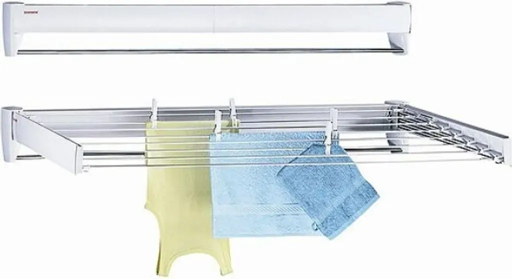 Zustand: Neu - Wandmontierte Wäscheständer - Leifheit Leifheit AG - 83305 - EAN: 4006501833051 - Platzsparend - Ob draußen auf Balkon, ob im Bad, Keller oder Küche: Der Wöscheständer für die Wand bietet überall dort einen Trockenplatz, wo kein Platz für das abstellen eines Standtrockners ist 7,20m Leine - mit 7,20m ausziehbarer Leinenlänge bietet der Wäschetrockner Platz für 1 kleine Waschmaschinenladung Kompakt - Der Wäschehalter für die Wand ist ideal für die kleine Wäsche zwischendurch oder den Single-Haushalt geeignet Drinnen und draußen - Die hochwertige, witterungsbeständige Verarbeitung des Wäscheständers ist sowohl für drinnen wie draußen geeignet Strom sparen im Haushalt - das natürliche Trocknen ohne Strom mit dem Leifheit Wandwäschetrockner ist nicht nur energiesparend, sondern schont auch die Umwelt und Wäsche Lieferumfang - Leifheit Wandtrockner Telegant 72 Protect, mit Montagematerial, 103 x 53 x 8 cm, Made in Europe, Artikelnummer 83305 - 24 Händler im amazon.de Marketplace ![]() ![]() Leifheit Wandtrockner Telegant 72 Protect, 7,20m Wäscheleine für kleine Haushalte, platzsparender Wäschehalter Wand, Wandwäschetrockner draußen und drinnen, Wäschetrockner für die Wäsche zwischendurch
