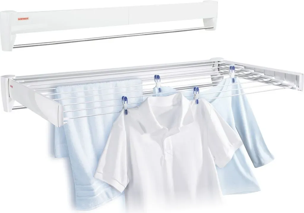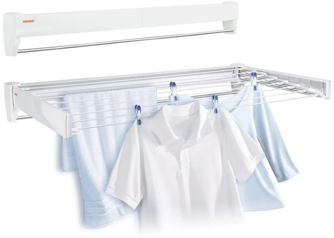 Kategorie: Wäscheständer - Leifheit - GTIN:4006501831002 - Platzsparender Wandtrockner für Balkon oder BadAusgezogen bietet er mit insgesamt 8,10 m Trockenlänge Platz für fast eine ganze WaschmaschinenfüllungMit praktischer Aluminiumstange zum Trocknen von Handtüchern Inkl. BefestigungsmaterialMaße: B 103 x T 53 cm - 26,40 Euro bei Kaufland.de - gefunden von billiger.de ![]() ![]() Leifheit Wandtrockner Telegant 36 Protect Plus zum Ausziehen, Wandtrockner ausziehbar für Wäsche, Wäschehalter Wand inkl. Handtuchstange, für drinnen und draußen, platzsparender Wandwäschetrockner