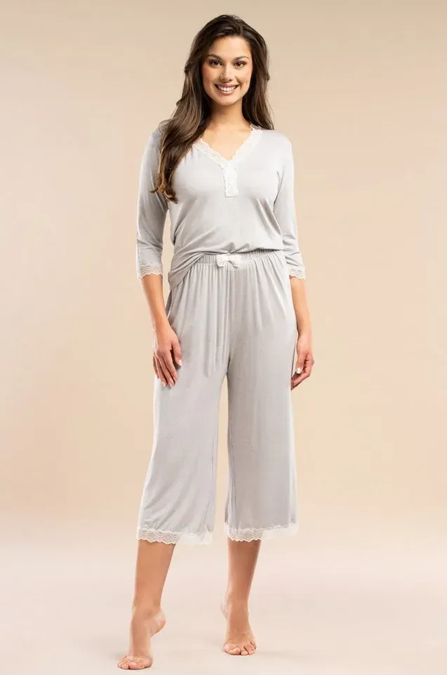 lieferbar-in 3-4 Werktagen bei dirMademoiselle Sommeil Pyjama Schlafanzug in grau mit Spitze, 3/4-Arm-Oberteil & 7/8-Culotte (2 tlg., 1 Stück) aus super weichem Viskose-Leinen-Mix 38/M