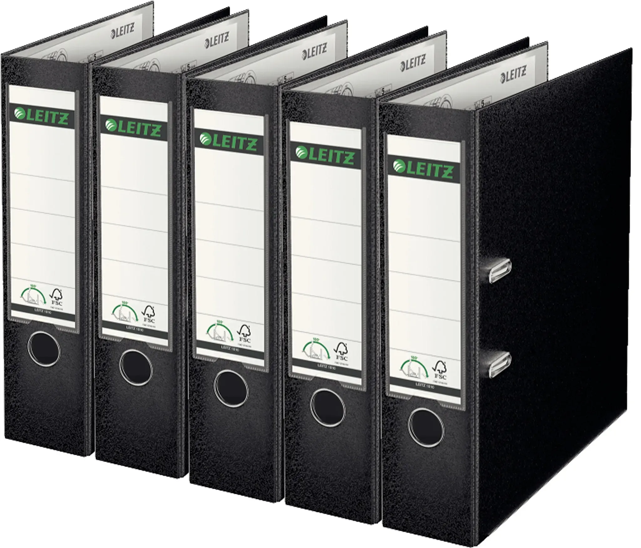 Auf Lager Versand durch AmazonVON Leitz 5er Pack Ordner A4, 100 % Recycling-Karton, Für 600 Blatt, 80 mm Rückenbreite, Klassisch marmoriert, Blauer Engel & FSC-zertifiziert, Für Schule, Studium & Zuhause, Schwarz, 10531095