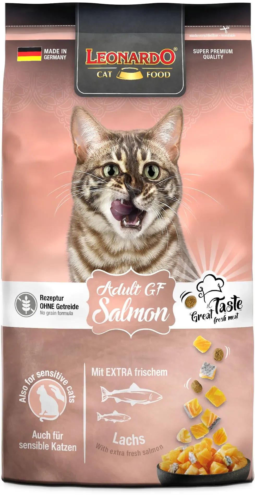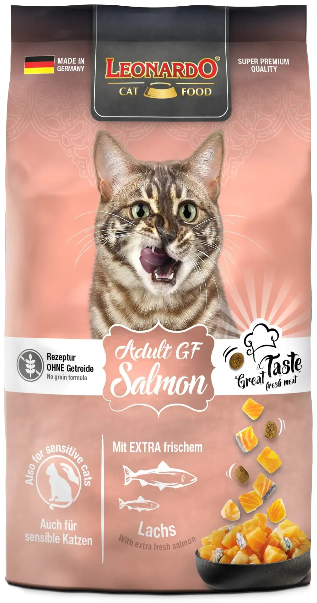 5 Händlerangebote bei billiger.de - Kategorie: Katzenfutter - LEONARDO - Erwachsener Lachs GF, 300 g Leonardo Cat Food Adult Salmon GF, Adult, jede Rasse, Lachs, 300 g, Getreidefrei, Gluten-frei Leonardo Cat Food Adult Salmon GF. Haustier-Altersstufe: Adult, Katzenrasse: jede Rasse, Geschmack Tiernahrung: Lachs, Gewicht: 300 g, Getreidefrei, Gluten-frei Schmackhafter Lachs für echte Fisch-Fans. Diese Rezeptur von LEONARDO Adult Salmon GF wurde speziell für sensible Katzen mit Futtermittelunverträglichkeit oder Neigung zu Allergien entwickelt. Auf den Einsatz von Gluten bzw. Getreide wurde verzichtet. Nährstoffreicher Amaranth ersetzt in dieser Zusammensetzung das Getreide. - GTIN:4002633758705 ![]() ![]() Katzen Trockenfutter - - Adult eBay GF Salmon mit Lachs 300g - Katzenfutter getreidefre